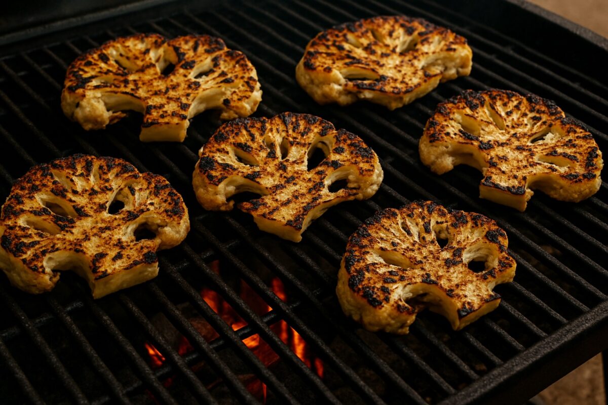Place the cauliflower on its head and, using a large knife, cut the cauliflower on each side, vertically, to remove the loose florets. Then cut two even ‘steaks’, at least 1 to 1 ½ inches thick.