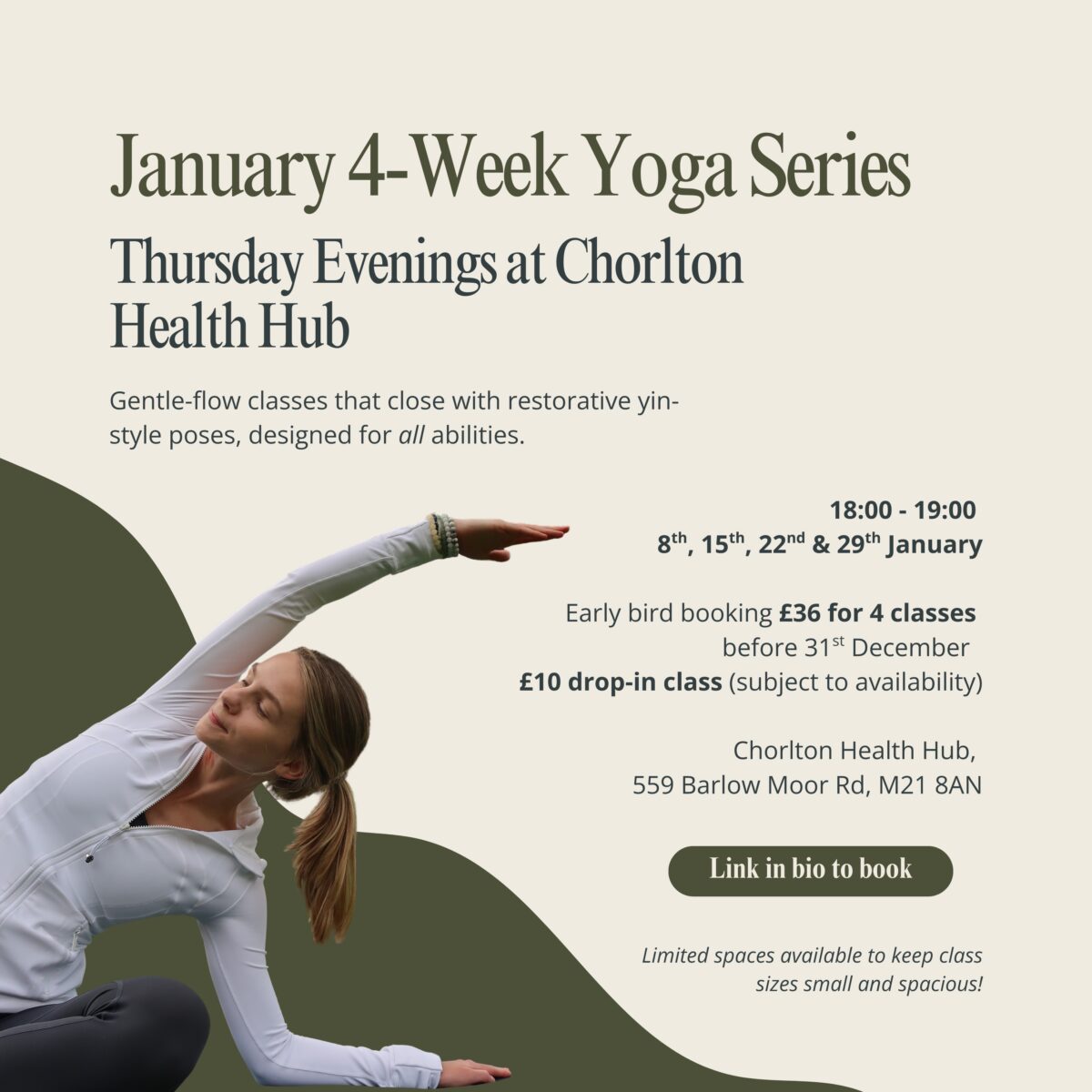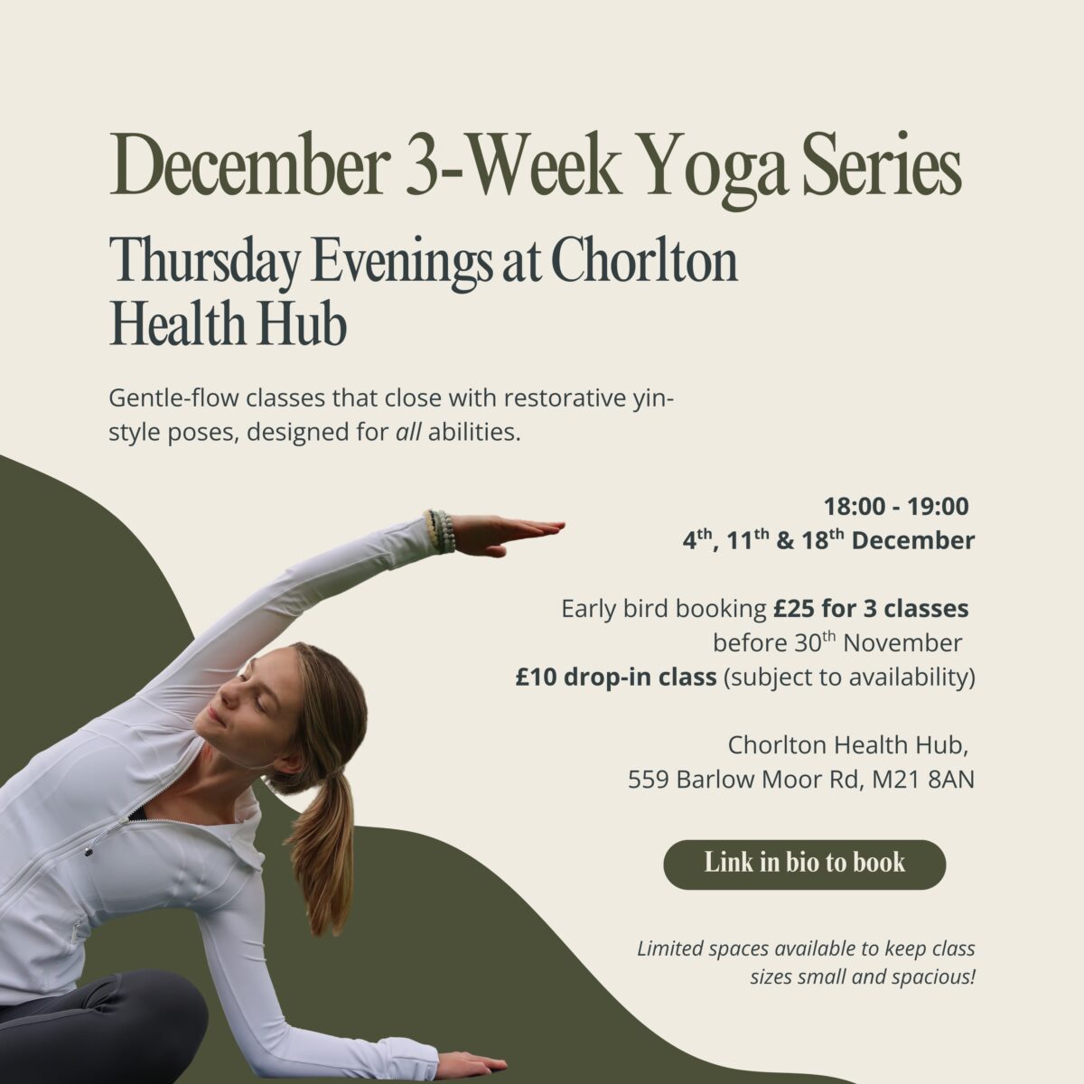 Excited to announce that Harriet’s Thursday evening gentle yoga classes at Chorlton Health Hub are here to stay!