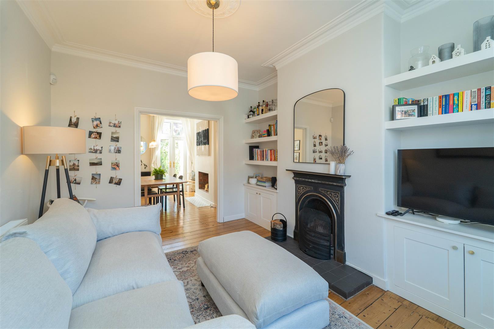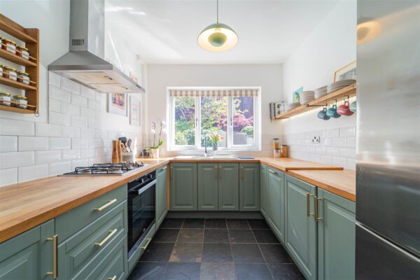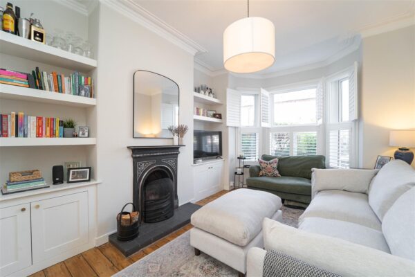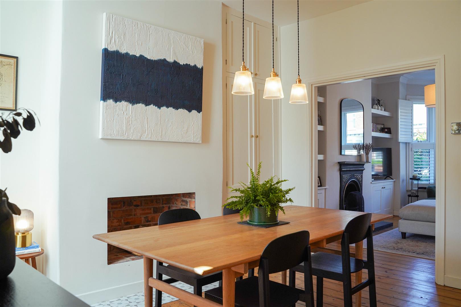 The thoughtfully arranged accommodation features an entrance hallway, a living room with an attractive fireplace and a front-facing bay window, leading through to a rear dining room with access to the enclosed courtyard-style garden and stairs down to a useful cellar. The floor is completed by a fully fitted kitchen.