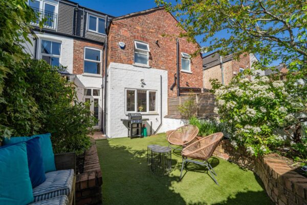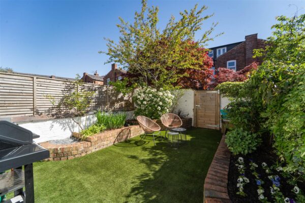 At the front, the property is enclosed by a low-level brick wall, with well-stocked flower beds featuring a variety of shrubs and bushes, and a paved pathway leading to the front door. To the rear, there is an attractive courtyard-style garden with an artificial lawn and raised, planted borders, ideal for outdoor seating. The space is enclosed by brick walls to the sides and rear, and includes a pedestrian gate providing access to the rear service alley.