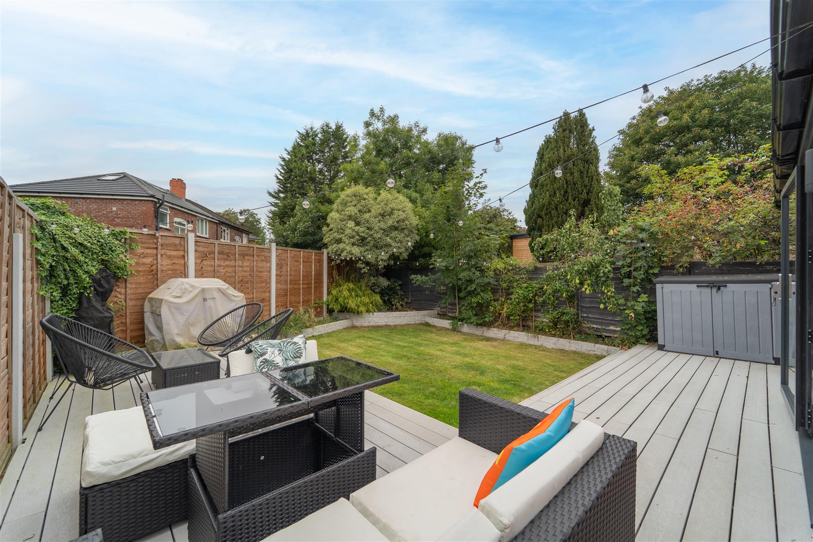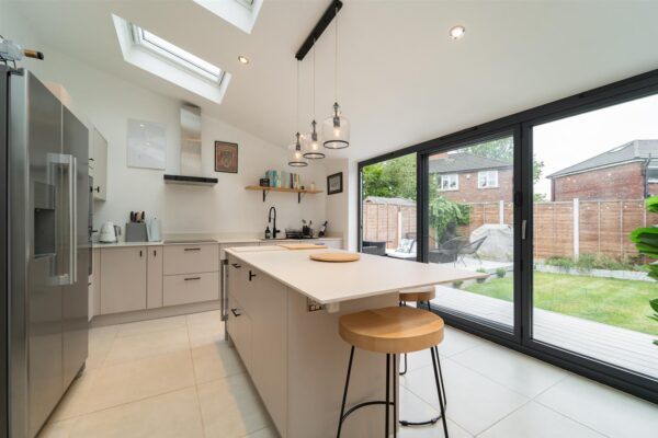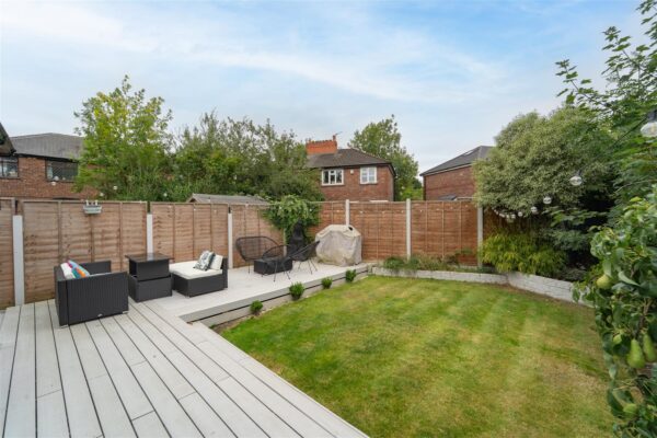 The property boasts an enclosed front garden with useful off-road parking, provided by a driveway. A beautifully landscaped, south-facing rear garden, perfect for both relaxing and entertaining. A sleek raised decked area flows seamlessly from the modern kitchen extension via bi-fold doors. The garden features a well-maintained lawn bordered by mature shrubs, and a second decked seating area.