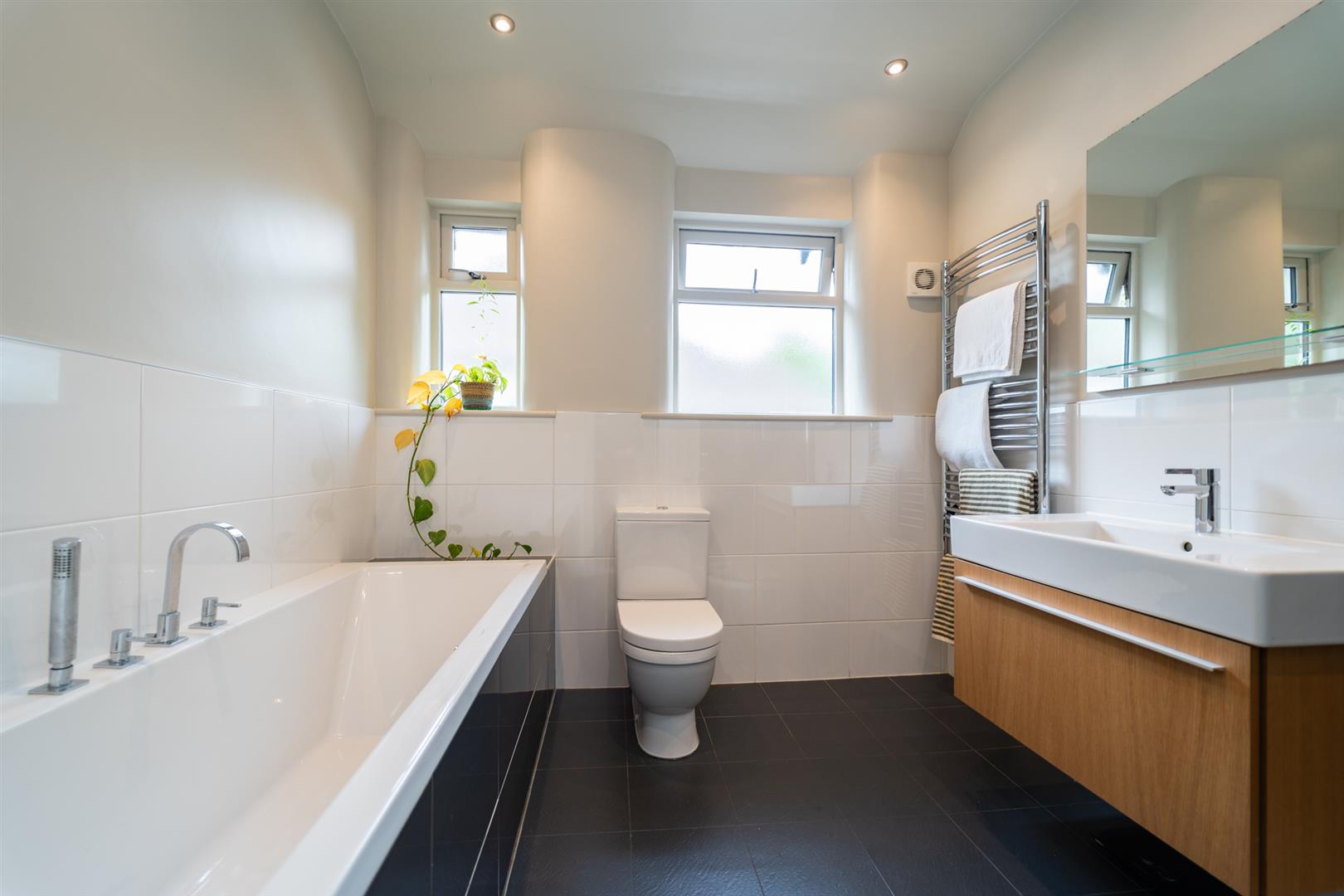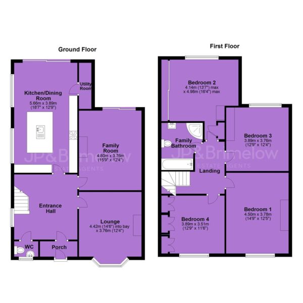 Whilst the first floor includes a landing leading to four sizable double bedrooms and a fitted four-piece white family bathroom.