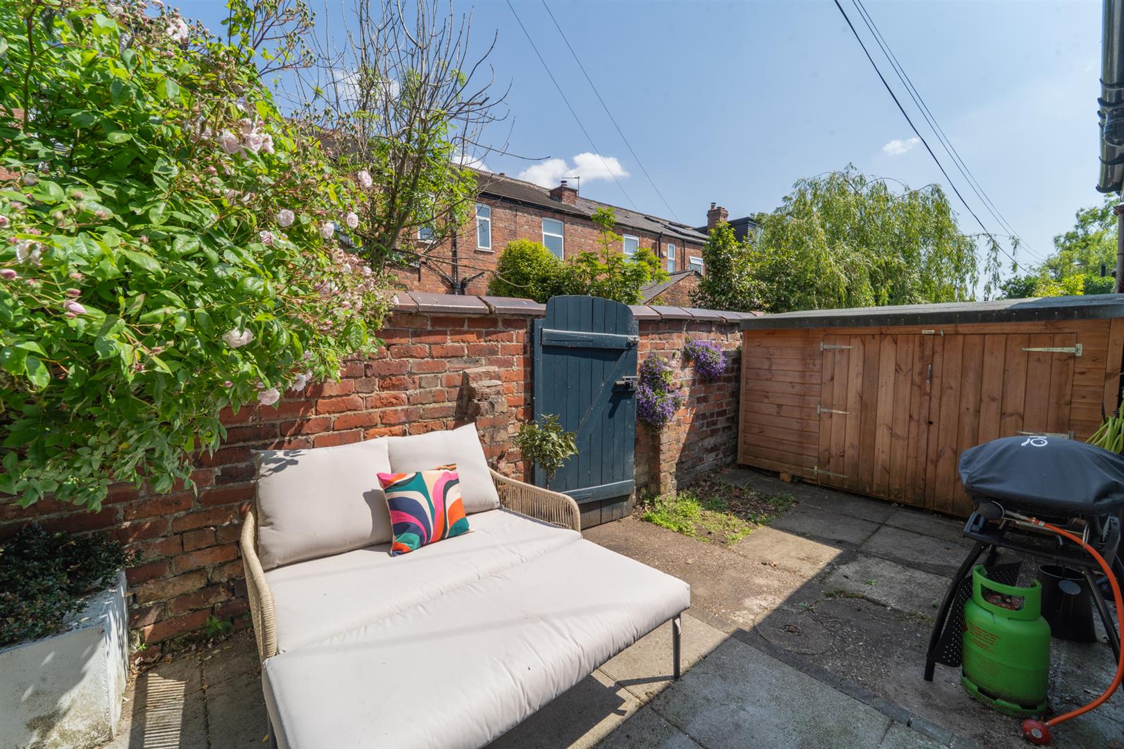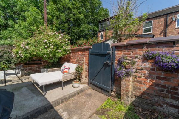To the side aspect there is a gate with shared access, leading to the service alley. To the rear aspect the landscaped courtyard style garden is enclosed by a brick boundary wall. A paved patio, ideal for a table and chairs and a lawned area with raised as well as planted flower beds. There are wall mounted lights, an outside water tap and electric power point.
