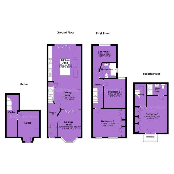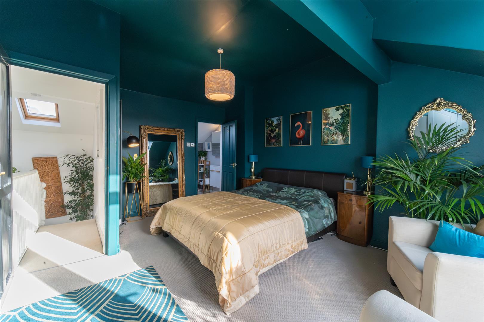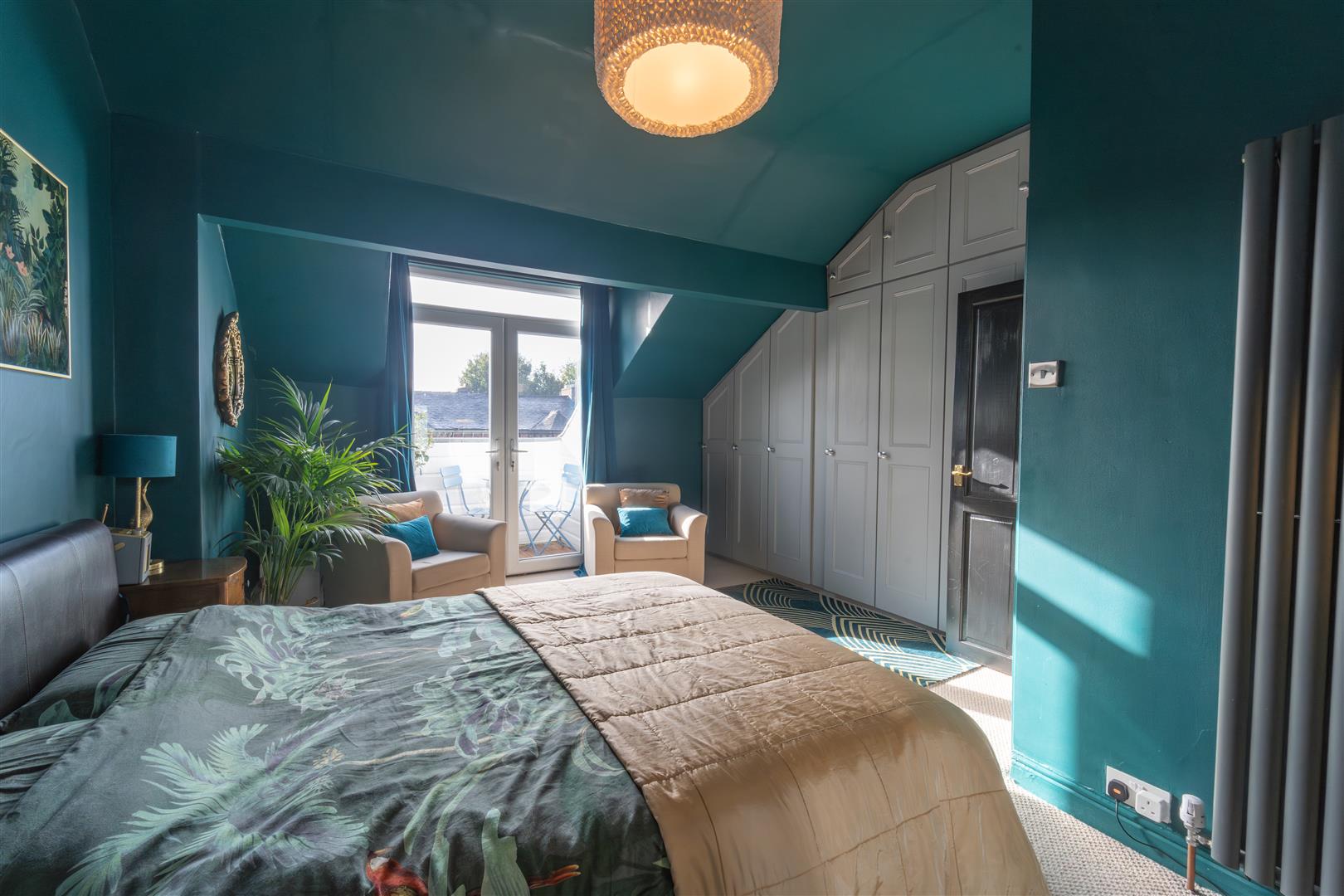 The second floor boasts a large double bedroom with a three-piece ensuite shower room, fitted wardrobes along one wall, and double doors opening onto a private balcony.