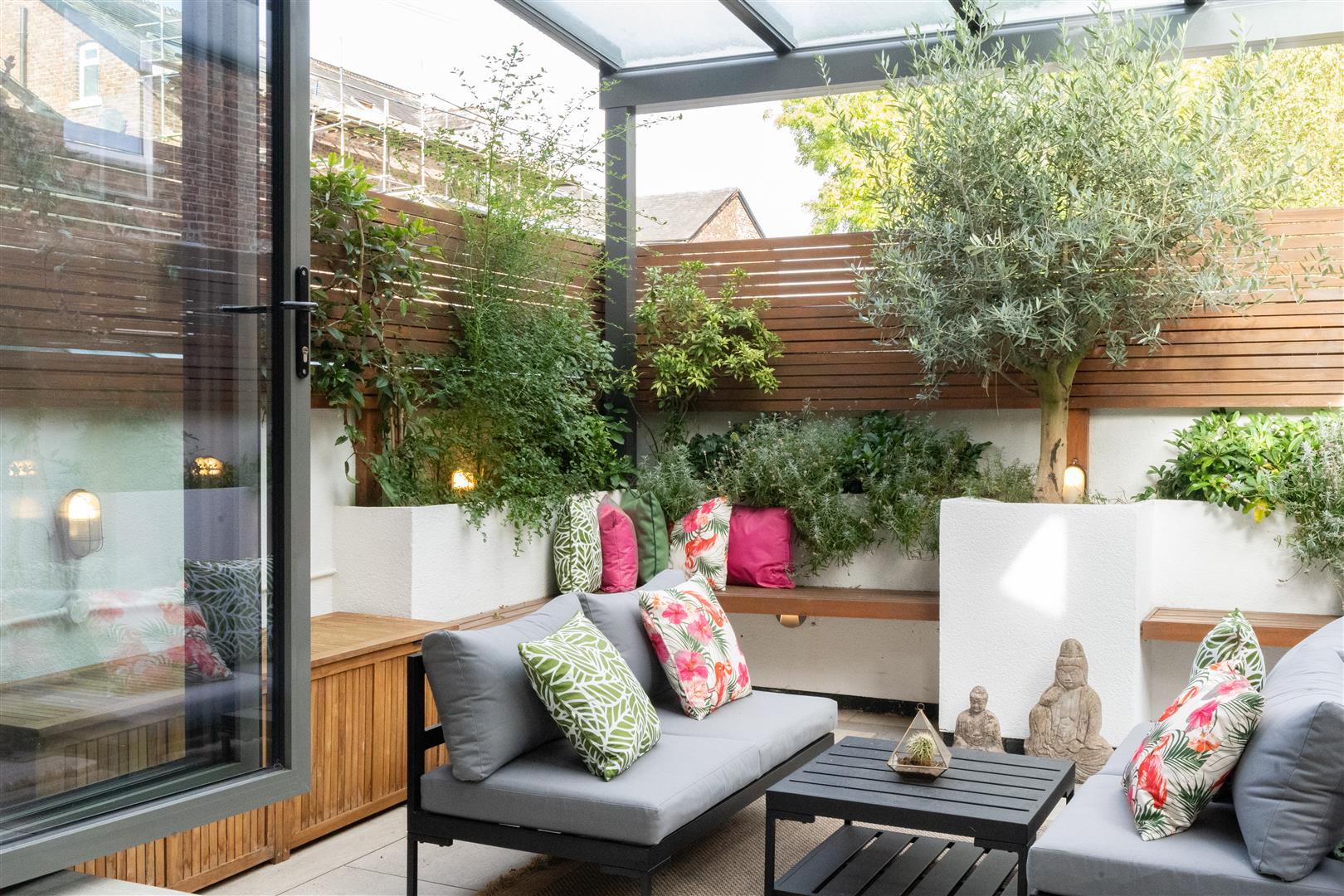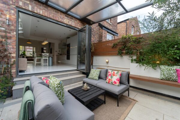 At the rear, there is a private courtyard-style garden enclosed by a brick boundary wall with wooden baton fencing, along with custom-built seating and a sheltered area. The front of the property offers off-road parking and includes an electronic car charging point.