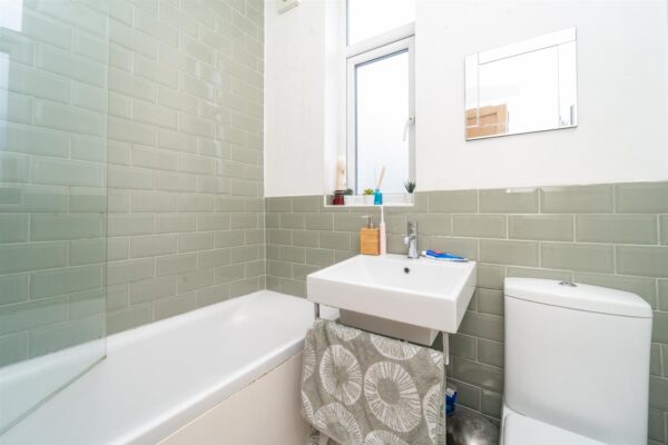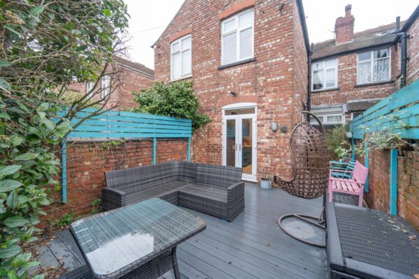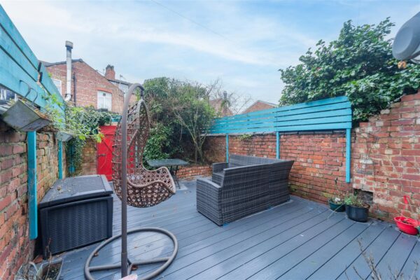 To the rear aspect there is a low maintenance decked courtyard enclosed by brick-built walls with baton fencing above and a timber gate allowing access into the service alley.