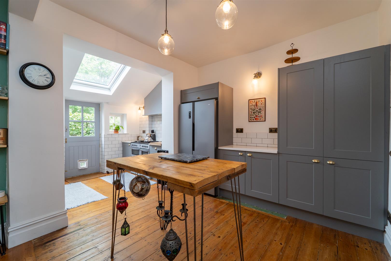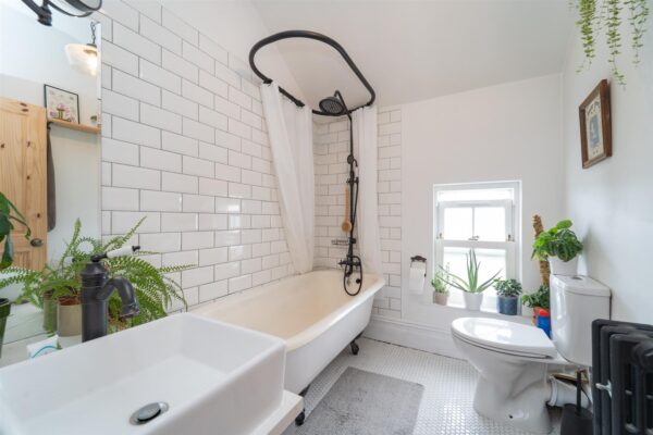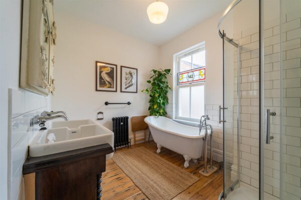 Stairs leading to the first floor reveal two good sized bedrooms, the principal benefitting from large sash windows and a three-piece en-suite shower room. A modern white four-piece bathroom suite complete with free standing roll top bath completes this floor.