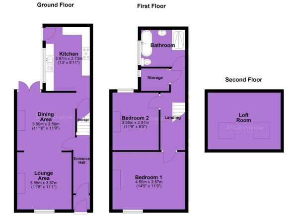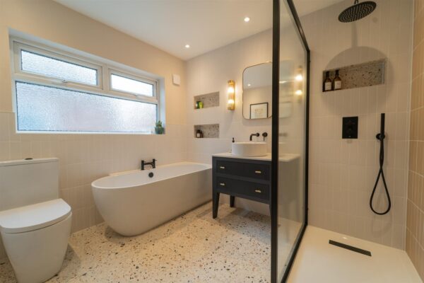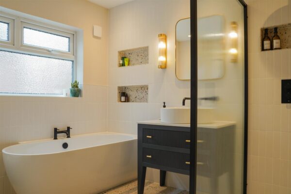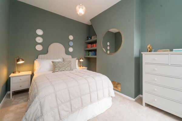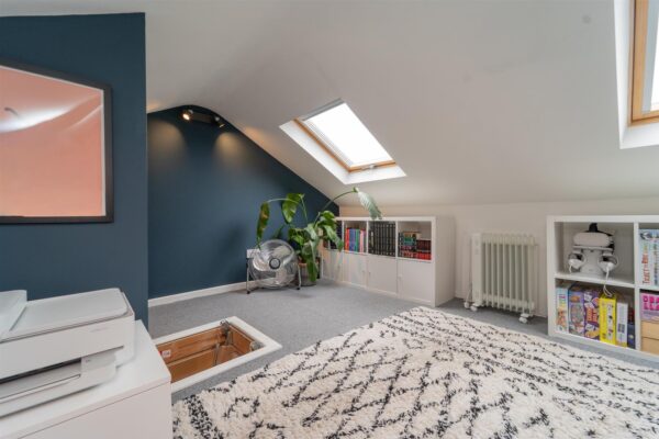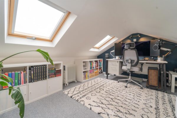 Stairs leading to the first-floor landing reveal two good sized bedrooms, a useful storage space and a beautiful modern four-piece bathroom suite. Additionally, pull down loft ladders lead up to the useful loft room with skylight windows, which is currently being used as a home office.
