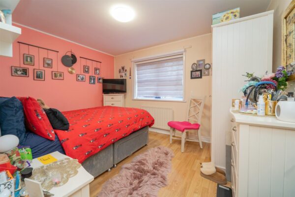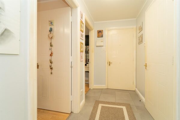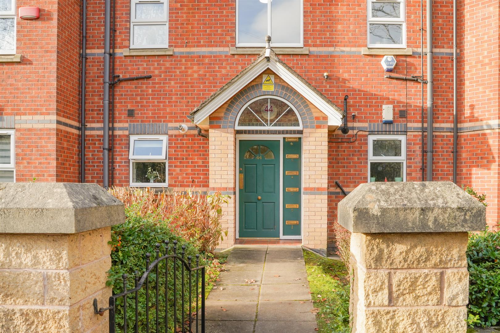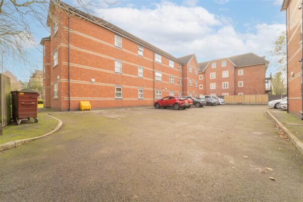 At the front, a pedestrian gate leads to the communal entrance. To the rear, there is a communal garden, predominantly laid to lawn and a rear communal car park.