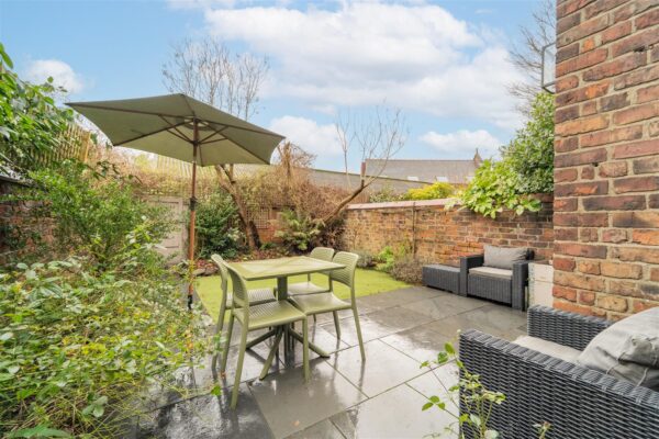 To the front, the house sits behind a low brick wall with established hedging, creating a sense of privacy from the street. A gated path leads to the front door, bordered by planted beds and mature shrubs. To the rear of the home, the garden offers a paved patio area ideal for outdoor seating, with surrounding borders filled with a mix of established plants, shrubs and small trees. Enclosed by brick boundary walls, the garden also benefits from gated access to the rear alleyway.