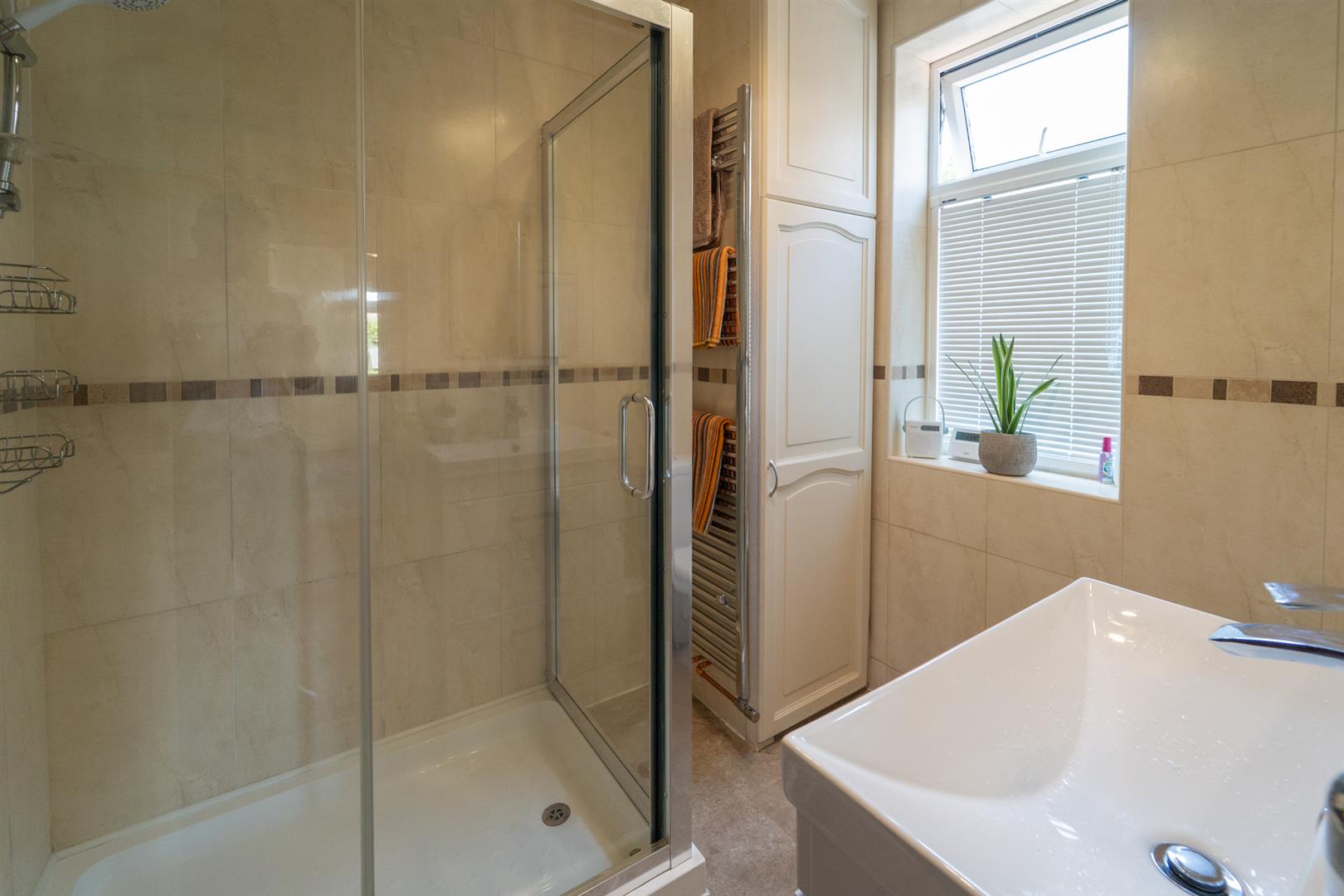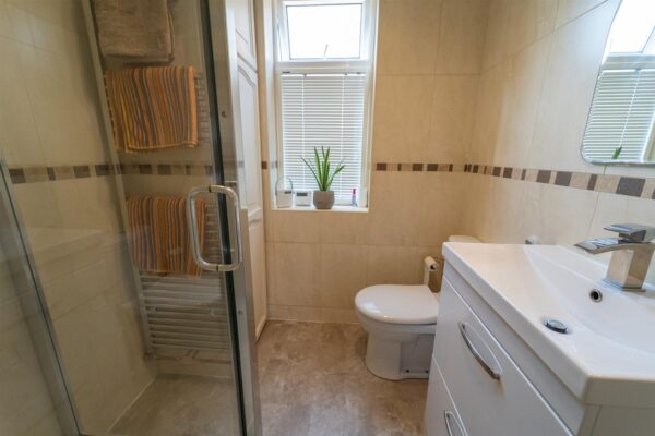 The first-floor landing reveals two double bedrooms, a further bedroom and a modern white three-piece shower room with a cupboard housing the combi boiler.