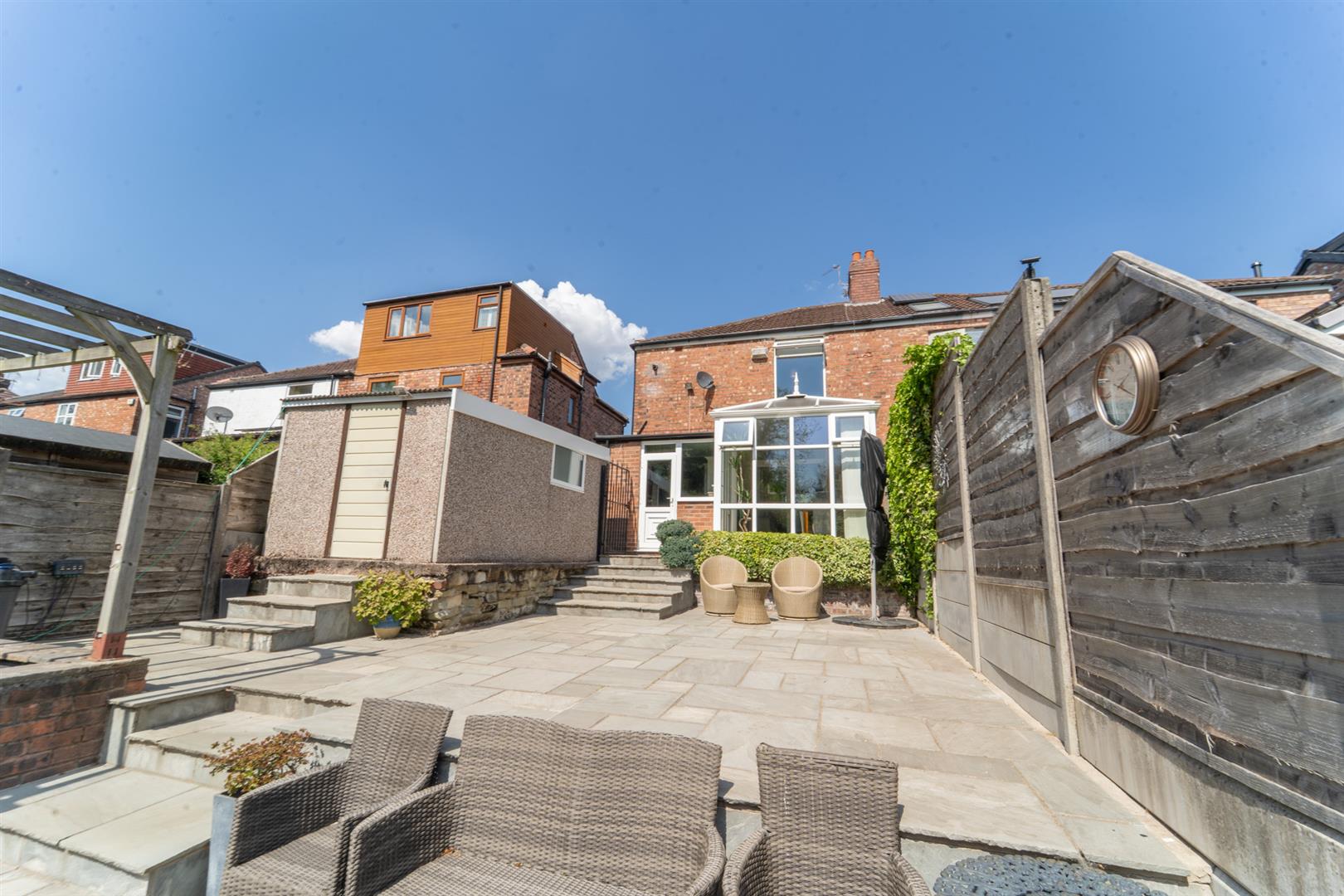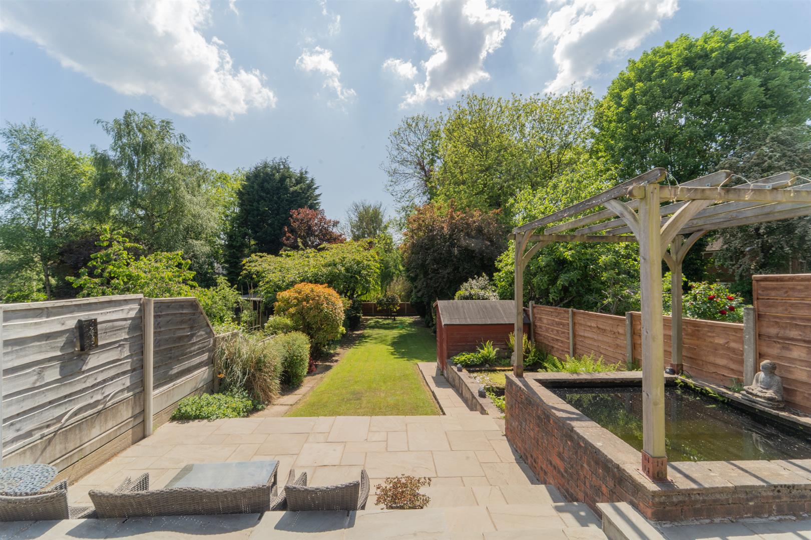 To the front aspect there is a low level brick boundary wall with a brick built boundary wall. Double gates leading to a block paved driveway providing off road parking. Well stocked and planted flowers. To the side aspect the driveway leads to a useful detached garage. To the rear aspect there is an impressive rear South facing enclosed lawned garden. A paved patio area ideal for table and chairs. Two raised fish ponds. A timber storage shed. Mature and established shrubs and trees.