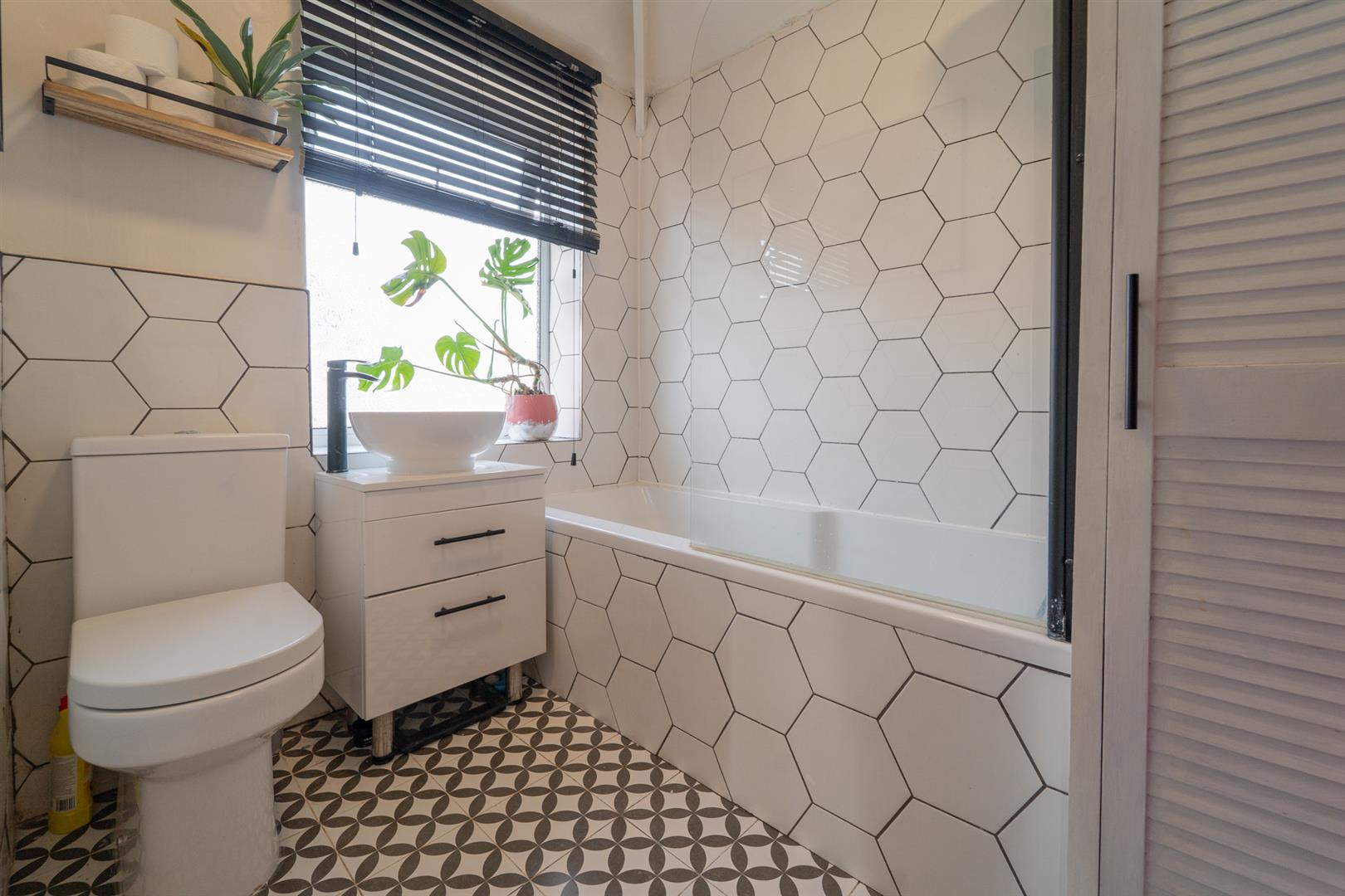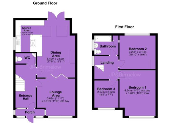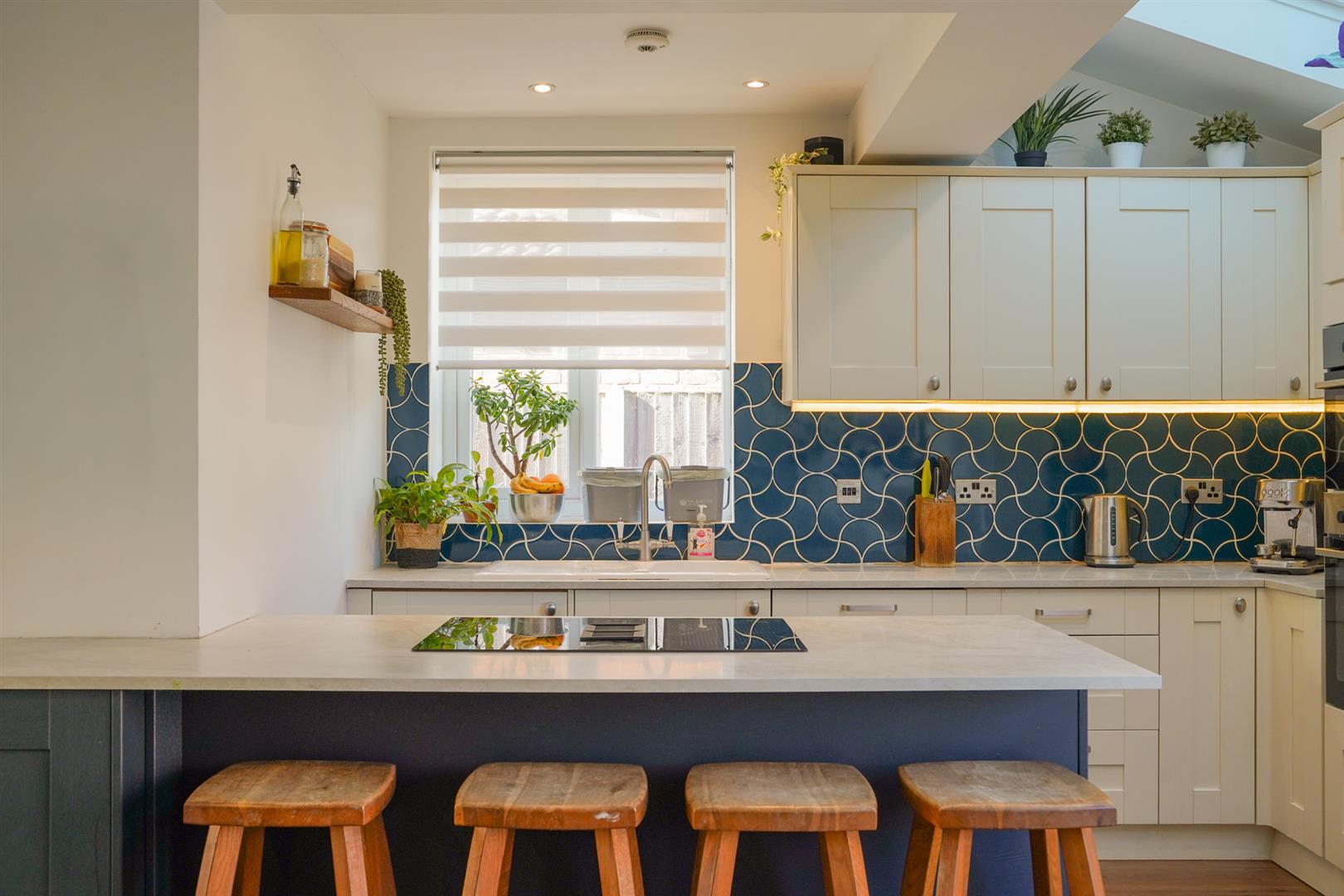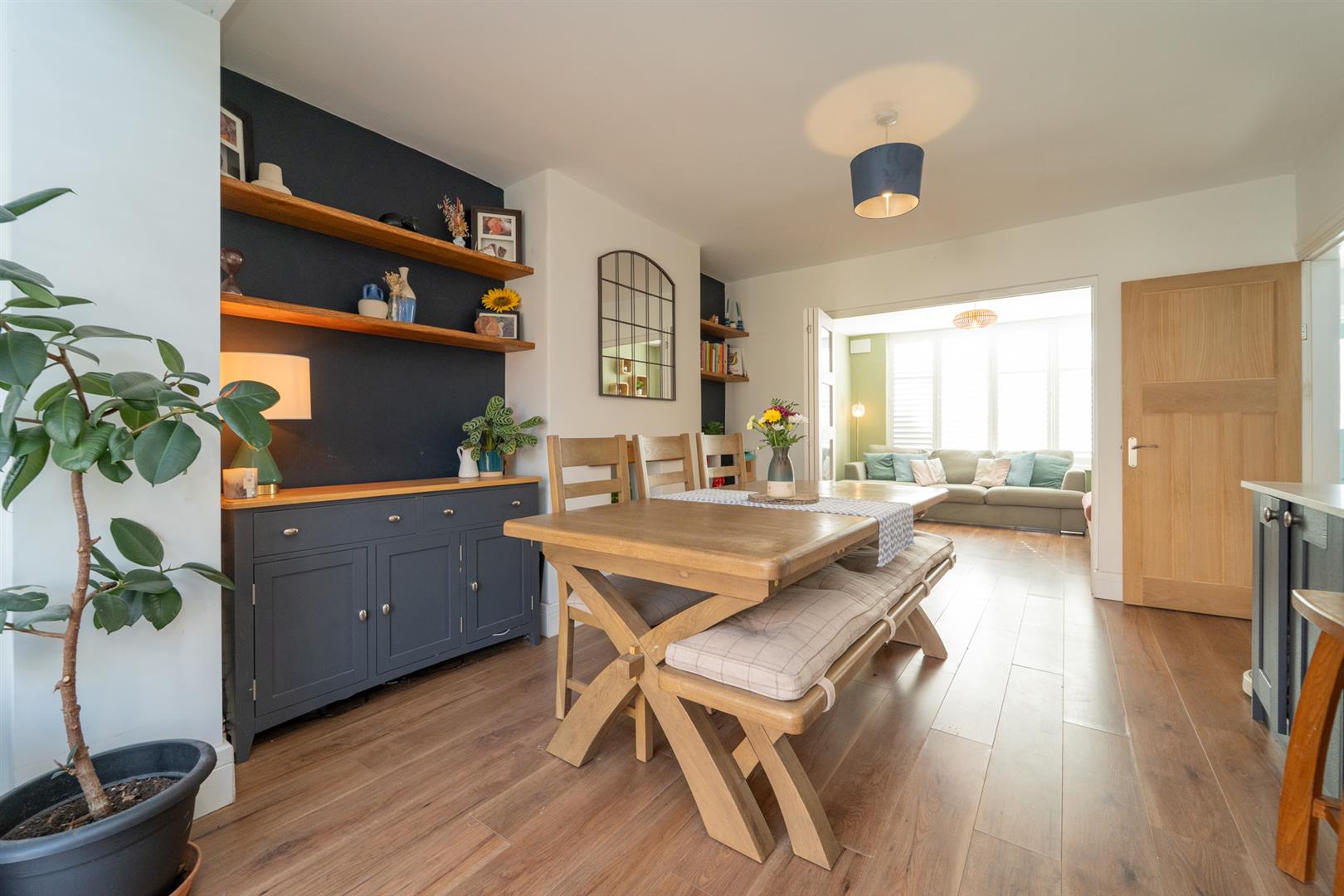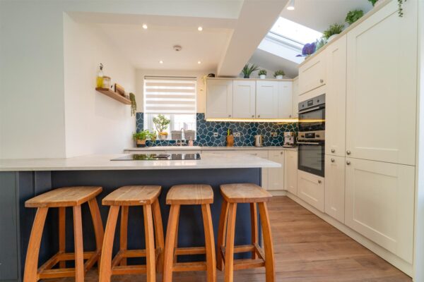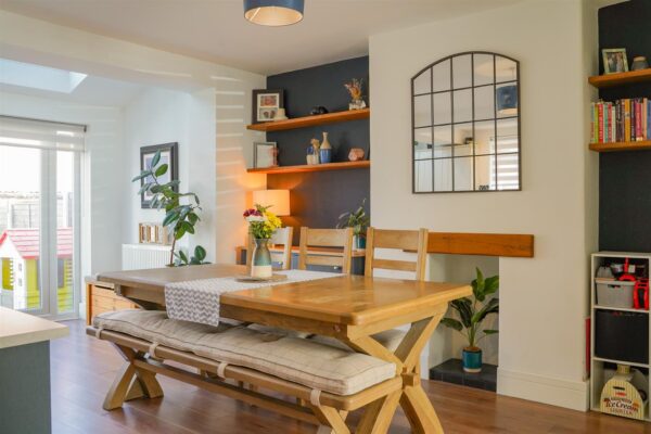The thoughtfully arranged accommodation includes a porch leading into a welcoming entrance hall, a front-facing lounge with a bay window, and a dining room to the rear that opens into a modern fitted kitchen/breakfast room. The ground floor also provides a W.C and access to an enclosed rear garden with a lawn.