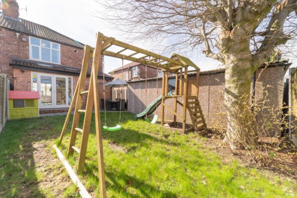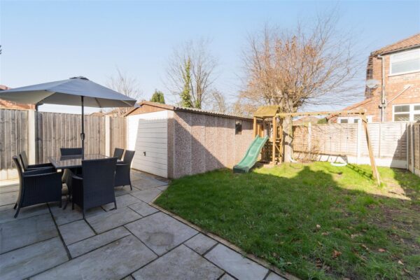 To the front, the property is set behind a low-level brick boundary wall with a mature hedgerow separating it from neighbouring homes, along with a paved driveway providing off-road parking for multiple vehicles. Timber gates lead down the side to the detached garage. The rear, offers an enclosed lawned garden, complemented by a paved patio area suitable for outdoor seating. The garden is bordered by timber panel fencing.