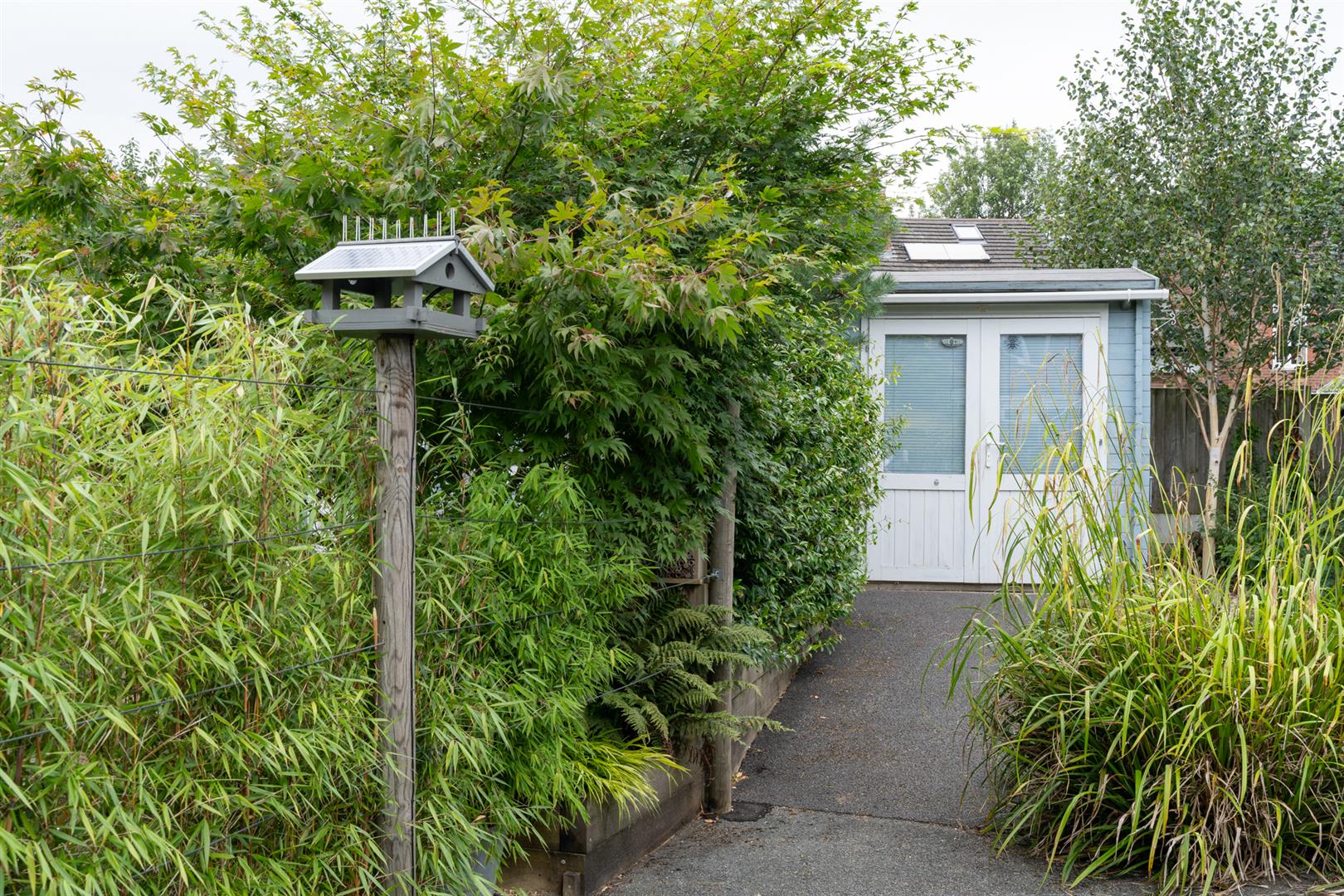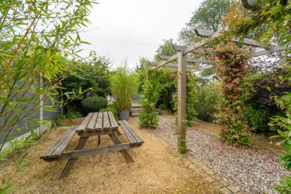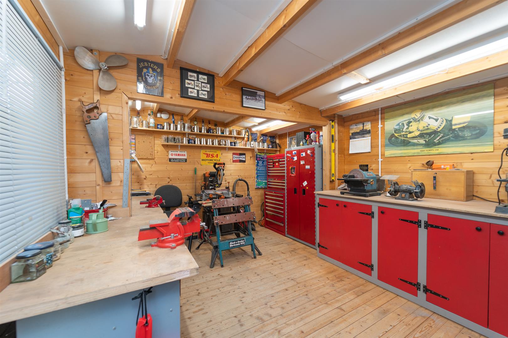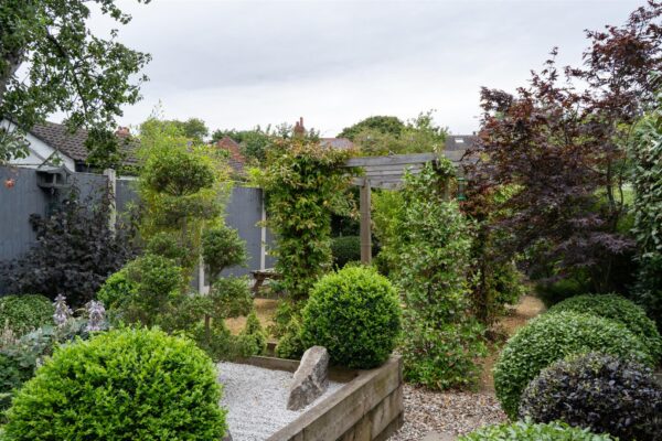 To the front aspect there is a low-level brick boundary wall. Pedestrian gate and block paved path leading to the front door. Mature hedgerow with the neighbouring property. Mainly laid with lawn. Raised and planted flower beds. Block paved driveway providing off road parking. To the side aspect there are double wooden gates leading to a shared block paved driveway. Wall mounted security light. Outside water tap. To the rear aspect is a landscaped garden with a Japanese theme throughout. Several patios with established and mature screening. A feature pond. Raised patio terrace. A detached wooden cabin being used as a workshop with power, lighting and an alarm system and a useful garden part for tools and bicycles.