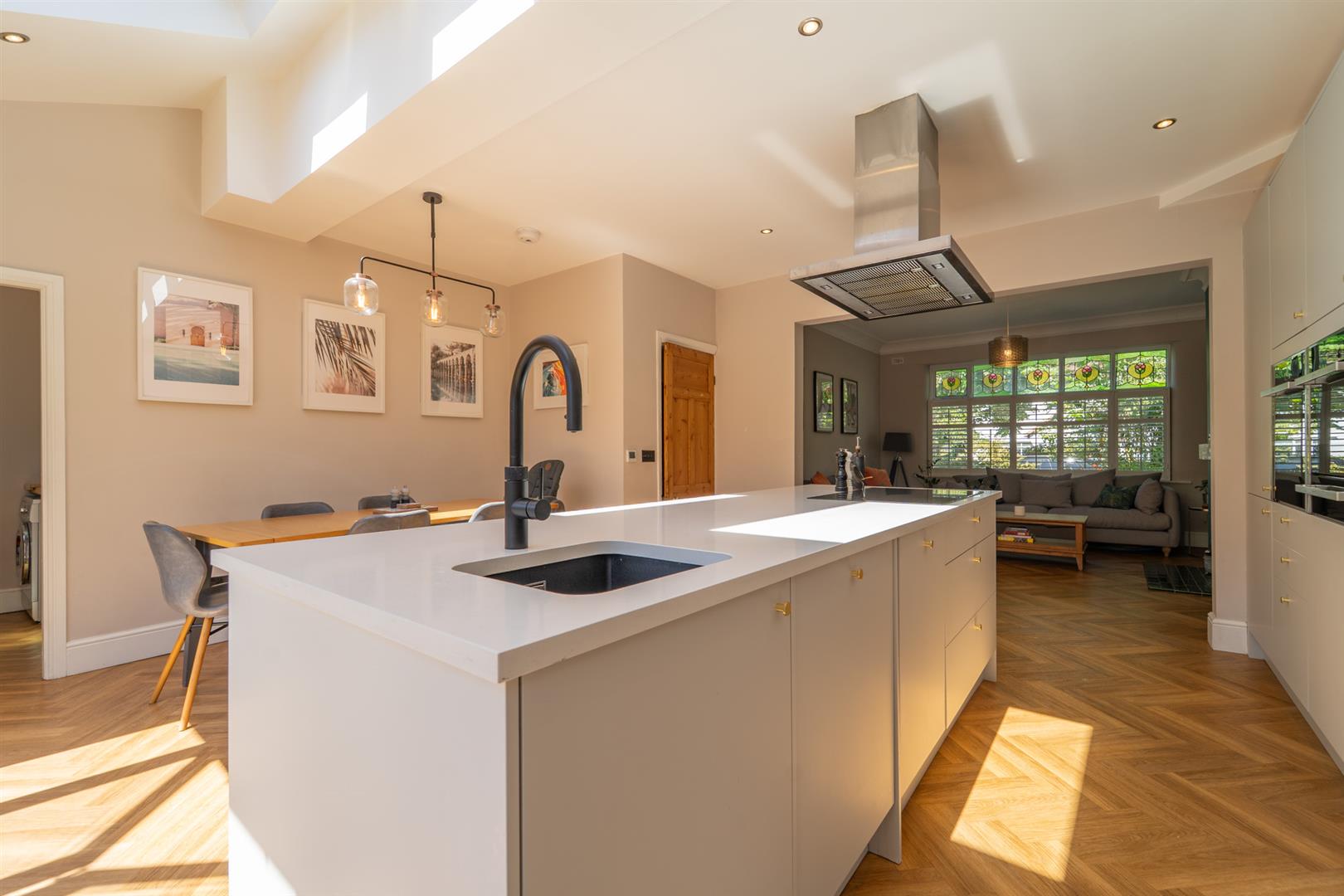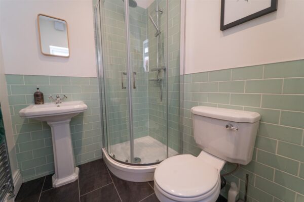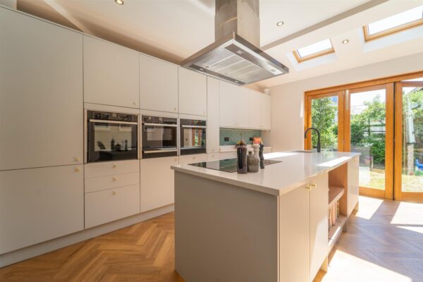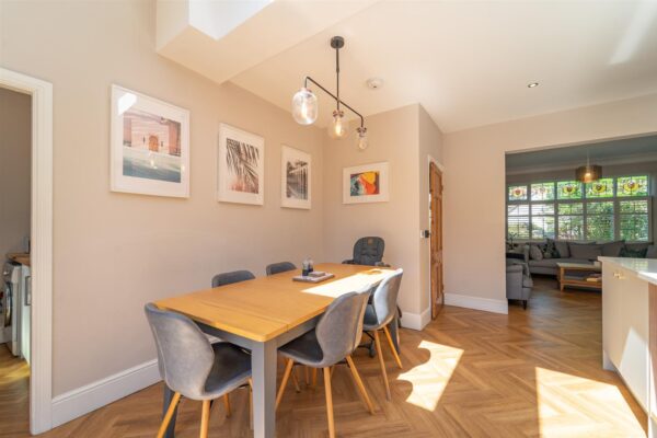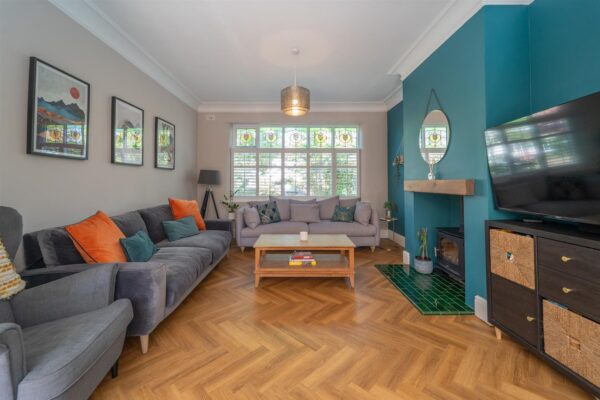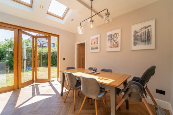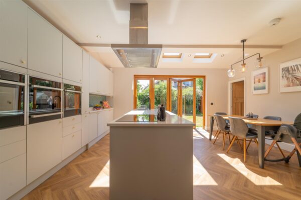 The well-planned accommodation consists of a welcoming entrance hall with herringbone flooring and a three-piece shower room. There is a lounge with bay window to the front aspect and a beautiful family room with log burning stove. To the rear there is an impressive open plan kitchen/ dining room, the kitchen is fully fitted with high end finishes, Bi-fold doors open out into the rear enclosed garden seamlessly blending the indoor and outdoor space. A useful utility room complete this floor.