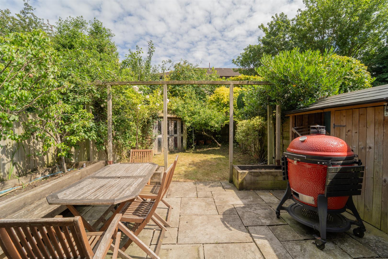 To the front aspect there is a low-level brick boundary wall, a selection of mature bushes sit within the garden. To the side aspect there is access into the rear garden. To the rear aspect there is a patio area ideal for a table and chairs, there is a useful timber-built storage shed, a lawned garden sits beyond the patio with a selection of mature bushes/ trees and shrubs. The garden is enclosed with timber fencing to the neighbouring properties.
