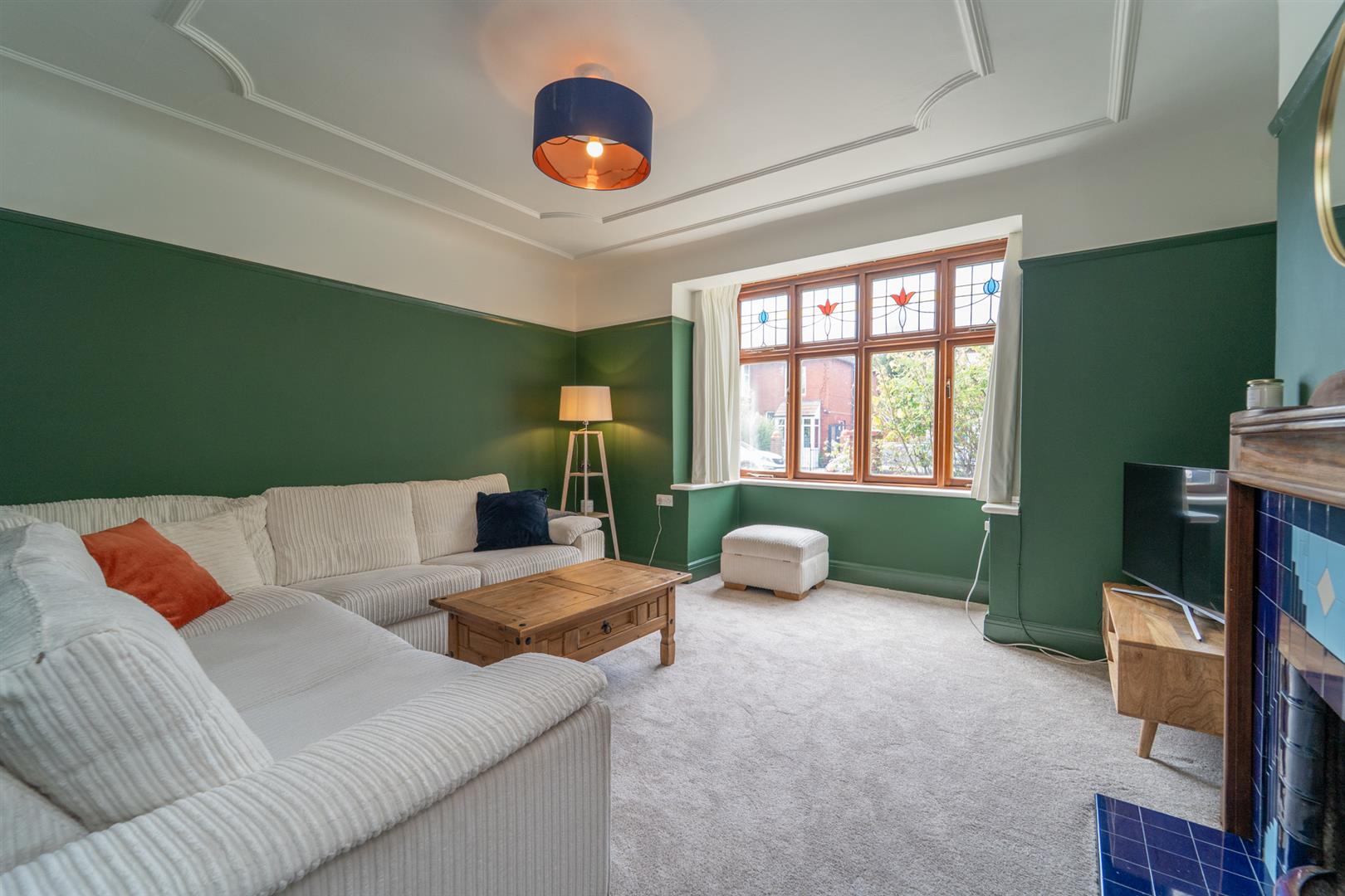 The property benefits from gas fired central heating, an alarm system, feature fireplaces, ceiling coving, partial stained glass, and front and rear enclosed gardens.