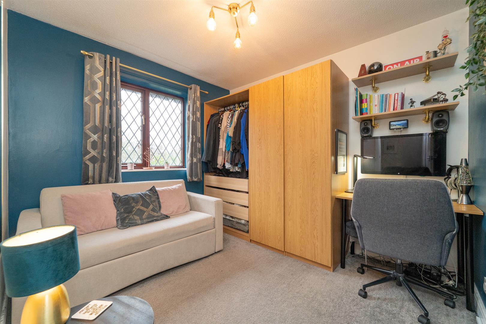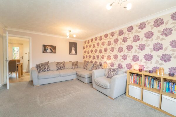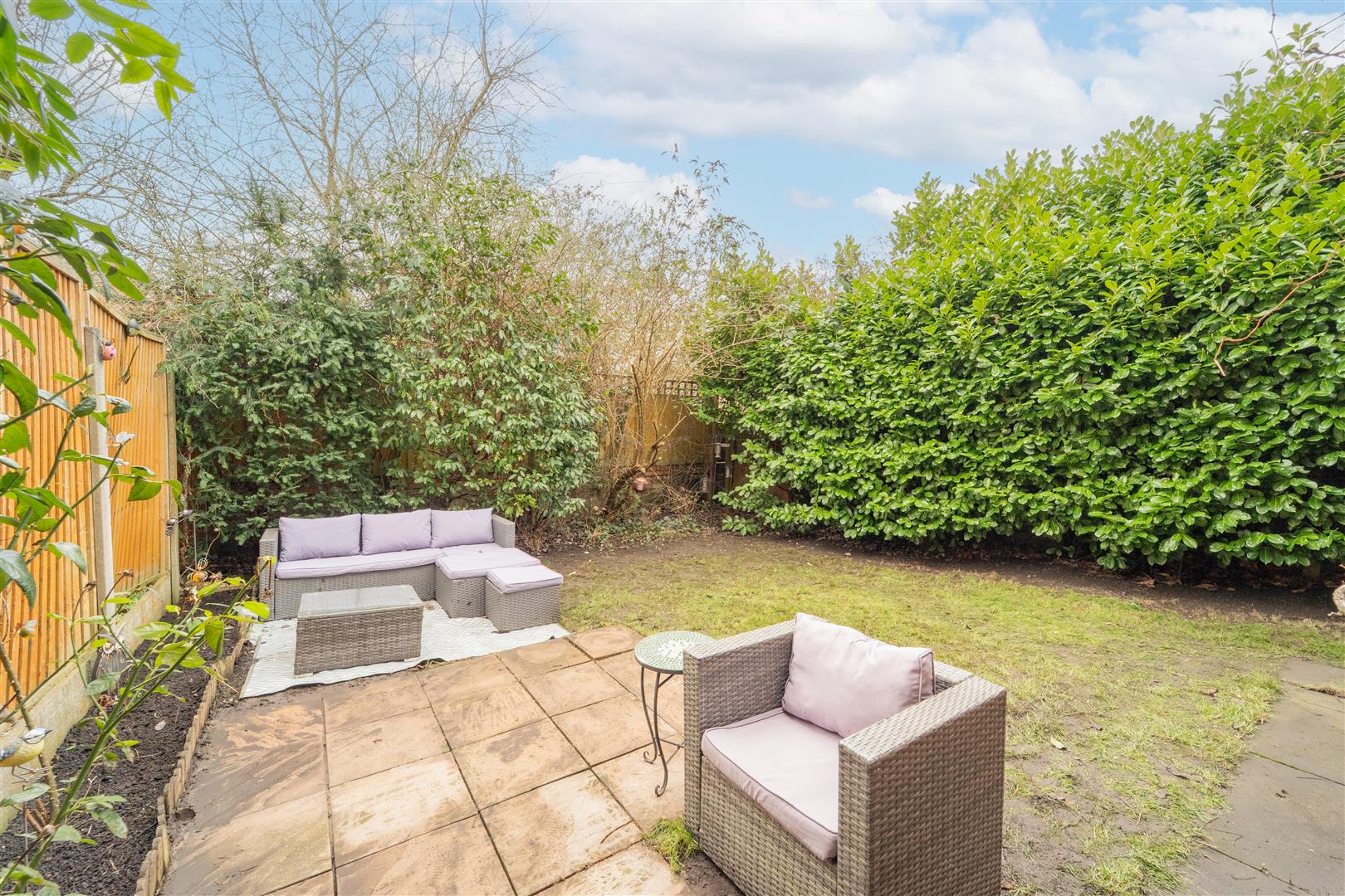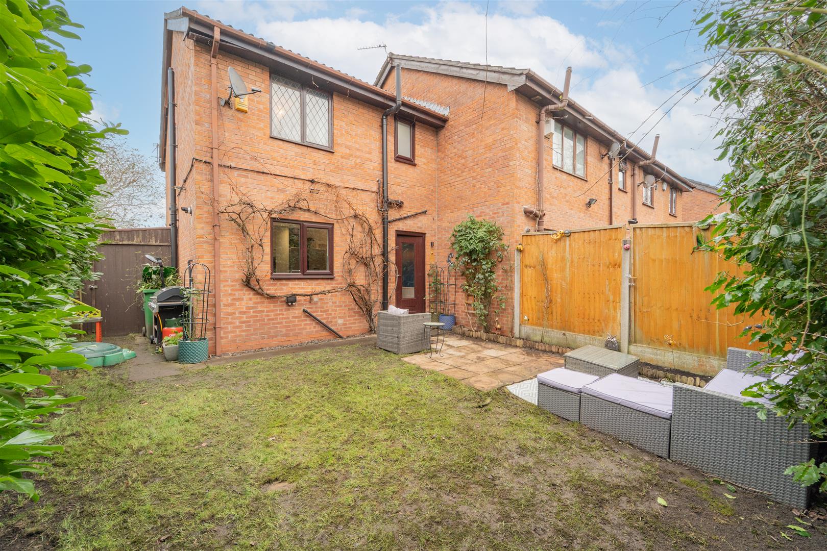 To the front of the property is a driveway providing off-road parking for two vehicles, complemented by planted flowerbeds and a pathway leading to the front entrance. To the rear is a fully enclosed lawned garden, bordered by timber fencing and featuring established planting, a mature tree, and a timber storage shed.