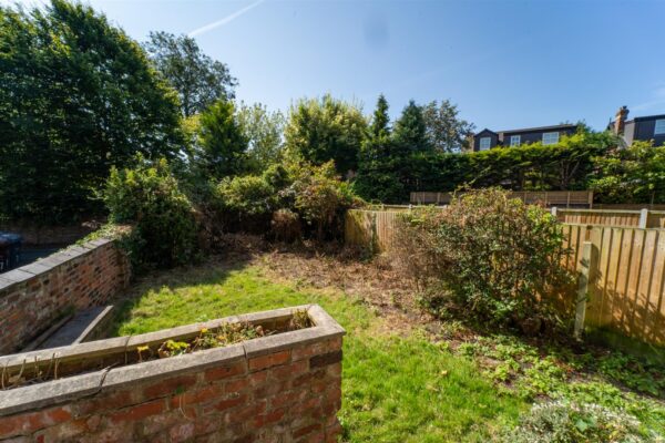 To the front of the property there is a boundary brick wall with flowerbeds and a raised porched entrance. The rear of the property features a lawn with a small raised decking area and bushes and shrubbery along the boundaries.