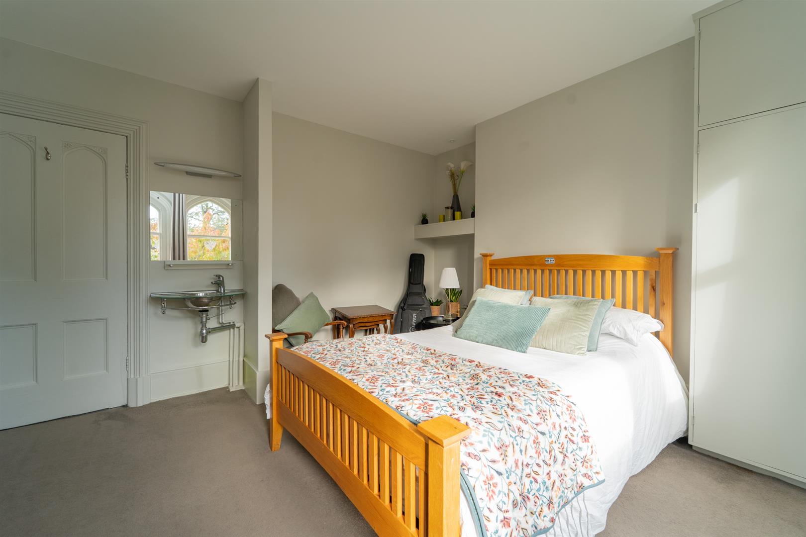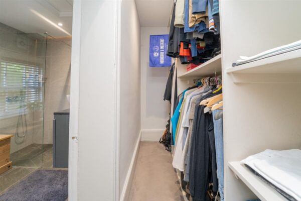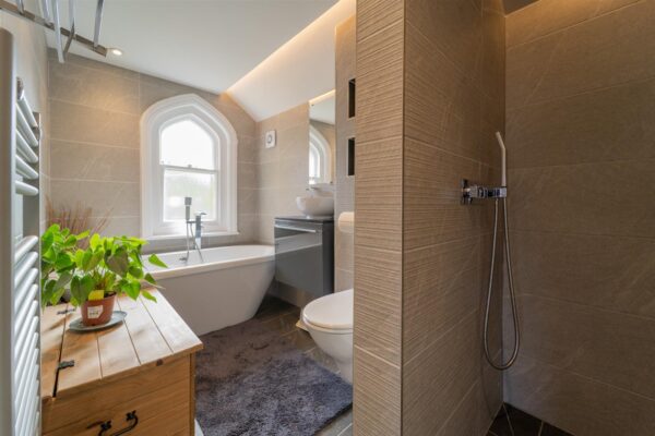 The first floor offers three double bedrooms, including one with a dressing area and a three-piece en-suite shower room, along with a further four-piece family bathroom complete with a walk-in shower and a rolltop bath.