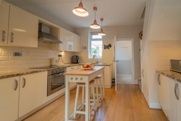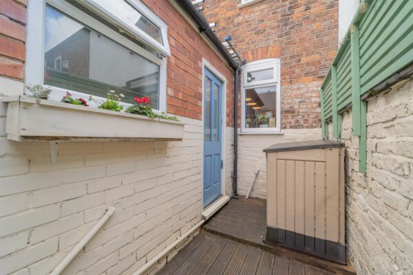 To the front aspect there is a picket fence, a paved front garden and pedestrian gate opening to a pathway leading to the front door. To the rear aspect the outdoor space is decked, there is a timber gate allowing access into the communal service alley.