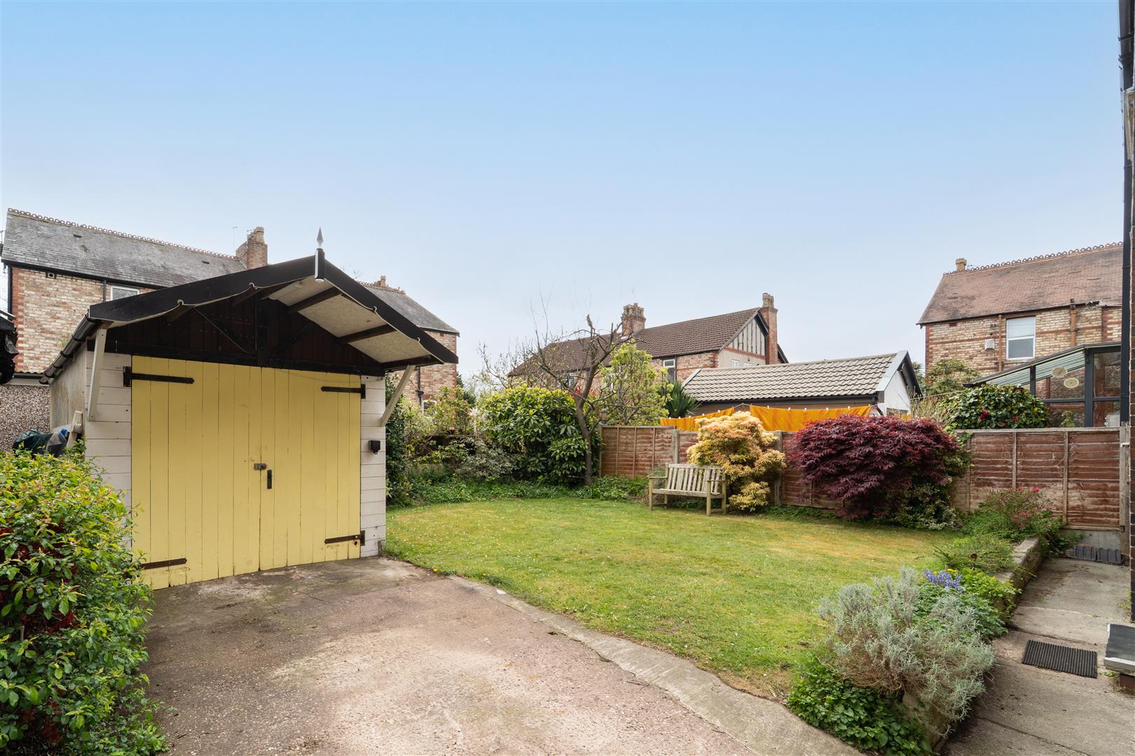 To the front, the property is enclosed by a brick boundary wall with well-stocked flower beds featuring a variety of shrubs and bushes. Metal gates open onto a driveway, offering off-road parking and access to the rear. At the back, there is a useful single garage and a generous lawned garden, bordered by timber panel fencing and complemented by flower beds filled with mature shrubs and plants.