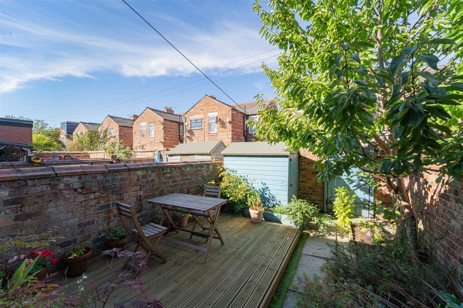 To the front aspect there is a low-level brick boundary wall and a block paved front garden. To the rear aspect there is a practical courtyard style garden with a decked area ideal for a table and chairs and a timber gate leading to the rear allowing access into the communal service alleyway.