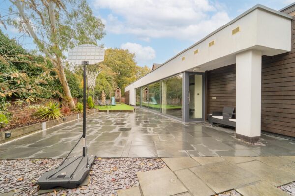 To the rear of this impressive and bespoke home is a beautifully landscaped garden, featuring a paved patio area leading to artificial turf, ideal for a children’s play area complete with climbing frame. There are raised flowerbeds finished with wood bark chippings, decorative lighting, and steps leading up to a raised patio terrace which is perfect for outdoor entertaining.