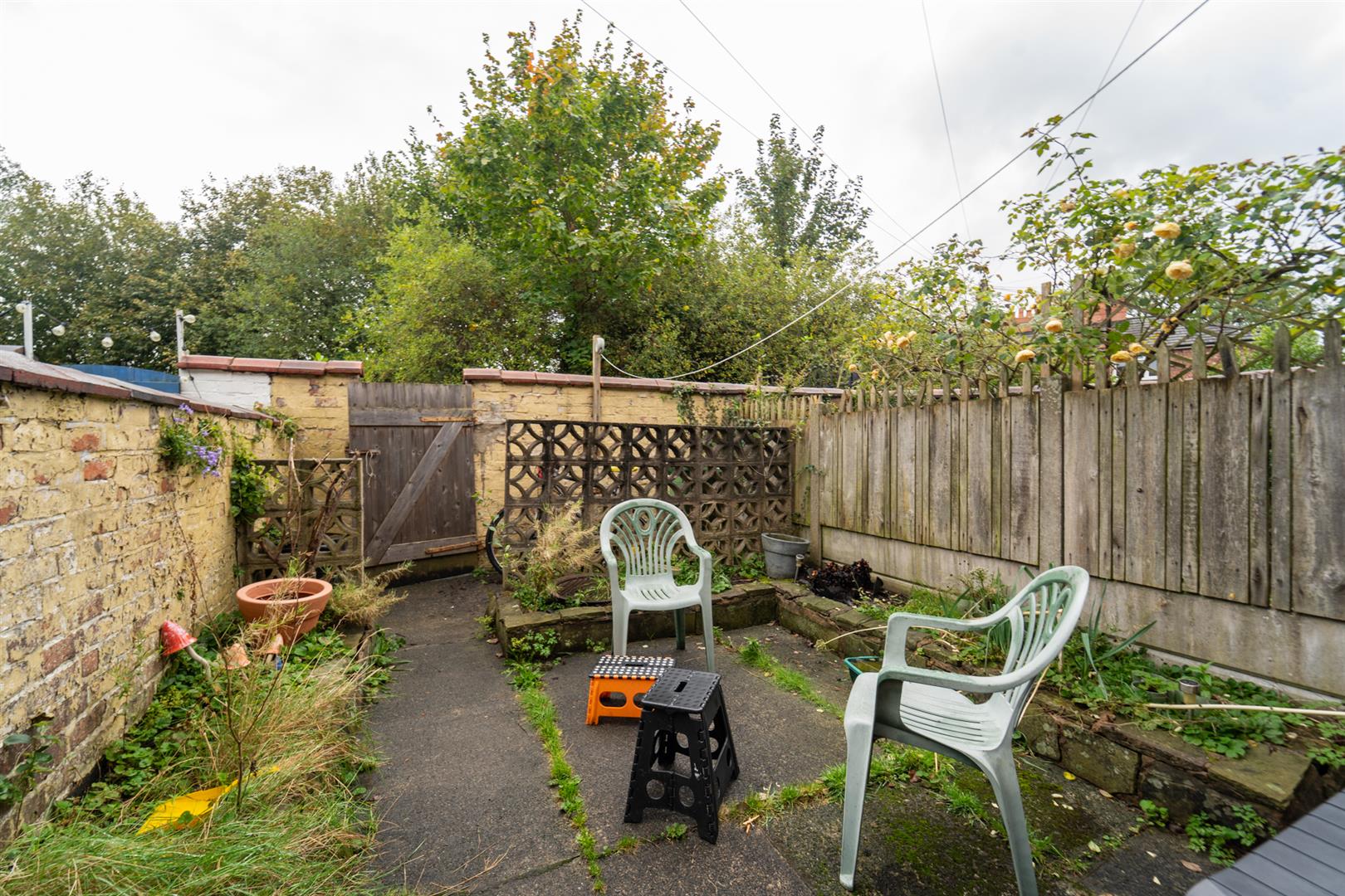 To the front, there is a low brick boundary wall and a pathway leading to the main entrance. At the rear, you'll find an enclosed courtyard-style garden with a boundary wall and a pedestrian gate opening to a gated alleyway. The patio area provides a perfect spot for a table and chairs.