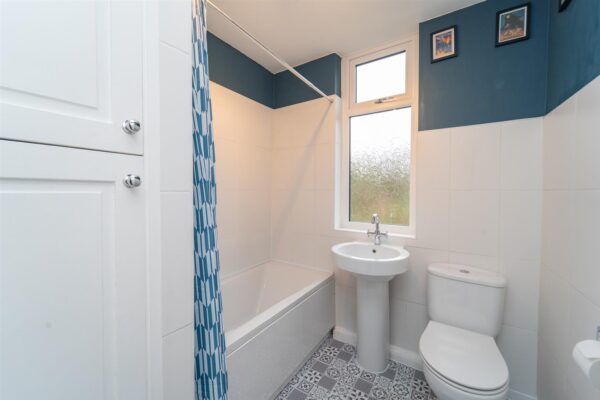 ursery and white three-piece family bathroom with a cupboard housing the combi boiler.