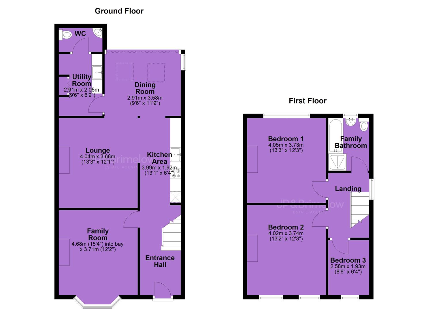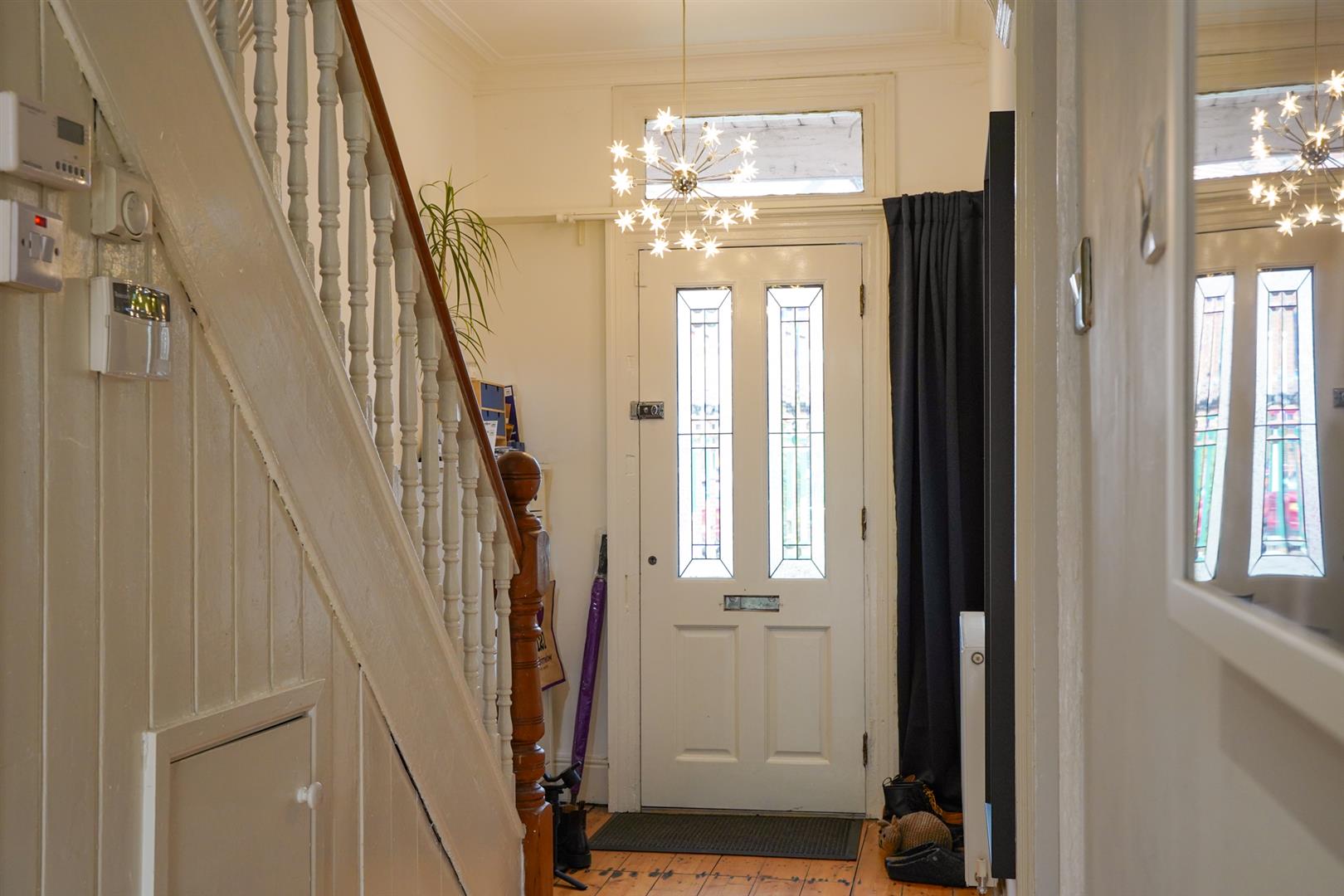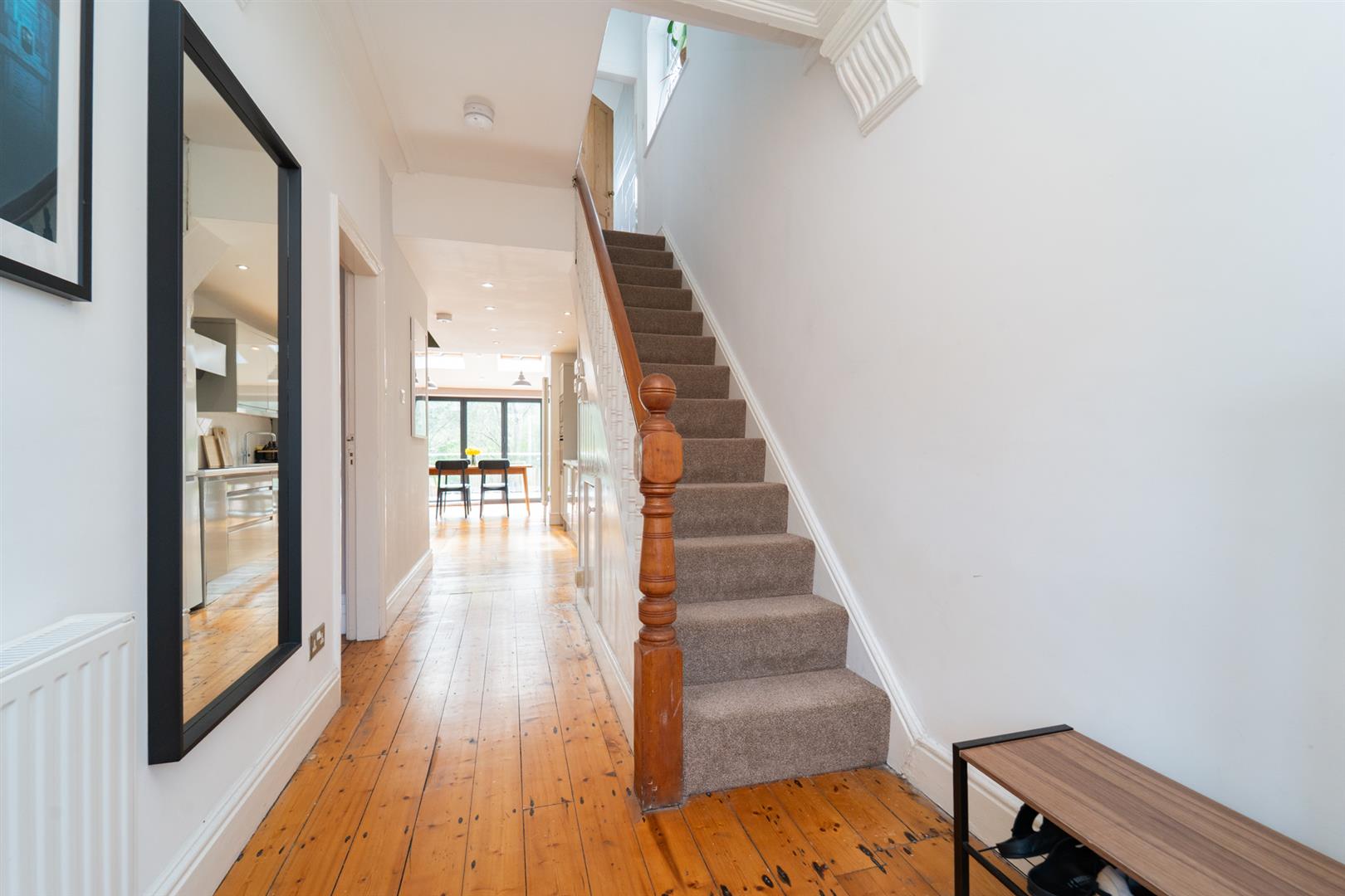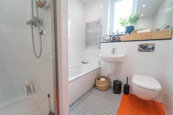 Stairs leading to the first floor, where there is a landing leads to three bedrooms and a white four-piece family bathroom suite.
