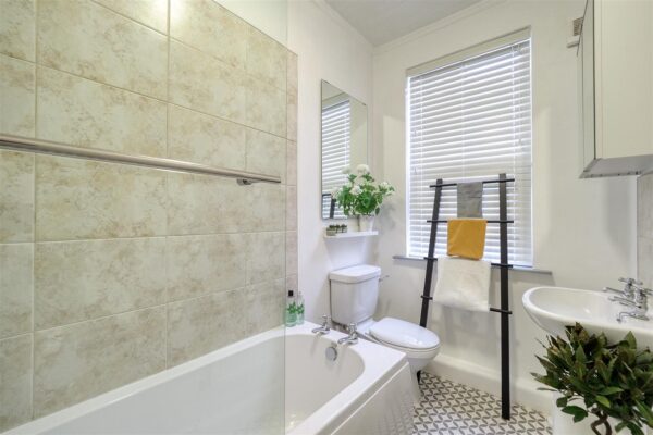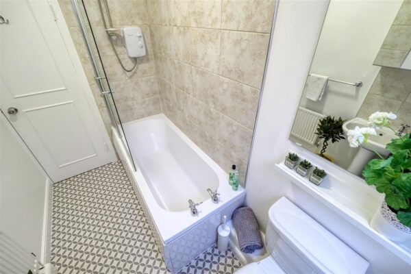 To the front, the property is defined by a low level brick boundary wall with a pedestrian path leading to the main entrance, framed by well tended planted flower beds. There is space allocated for recycling bins to one side. Access onto a paved driveway to the rear, offering two convenient off road parking spaces.