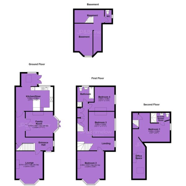 The ground floor is accessed through an impressive entrance hallway featuring varnished floorboards and leading to the reception rooms and basement. The elegant lounge boasts a bay window overlooking the front aspect and a cream marble fireplace. There is also a family room with a bay doorway to the side and a charming feature fireplace. The spacious, fully fitted kitchen/dining room includes a breakfast island, while a convenient utility room with access to the rear garden completes the ground floor.