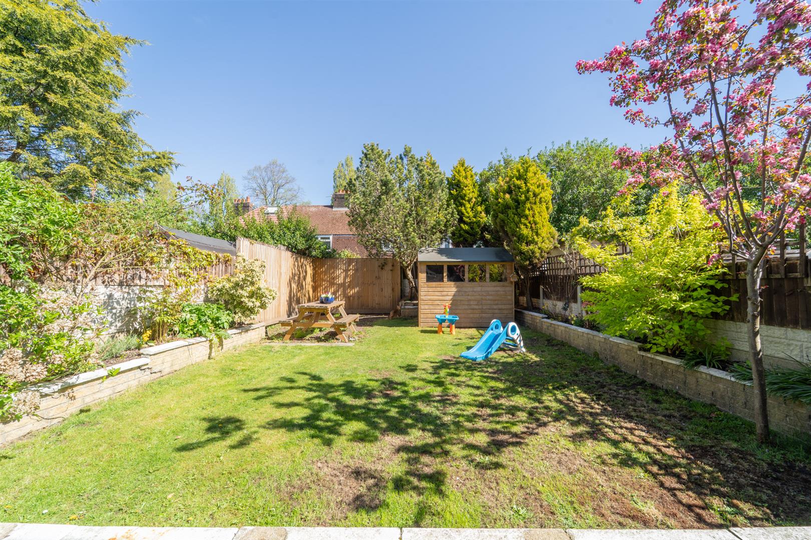 To the front aspect there is a low-level brick boundary wall and a paved path leading to the front door and a practical driveway, provides off-road parking. A gate leads to a shared alleyway with the neighbouring property leading to the rear garden. The rear good-sized garden is enclosed by timber panelled fencing with the neighbouring properties. Mainly lawned with a useful timber shed and Raised and planted flower beds with a selection of shrubs and bushes.