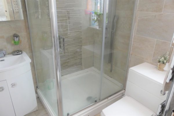 Fully tiled with shower cubicle and shower unit, low level wc, frosted Upvc window.