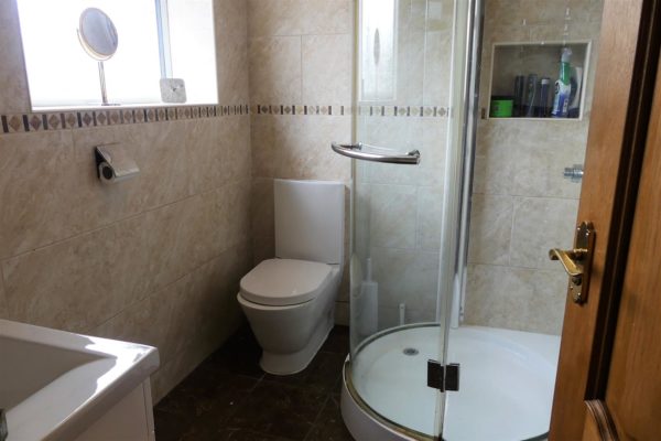 Fitted with a shower cubicle. Vanity wash hand basin and low level W.C. Heated towel rail. Fully tiled. Ceiling light points and UPVC double glazed window to side aspect.