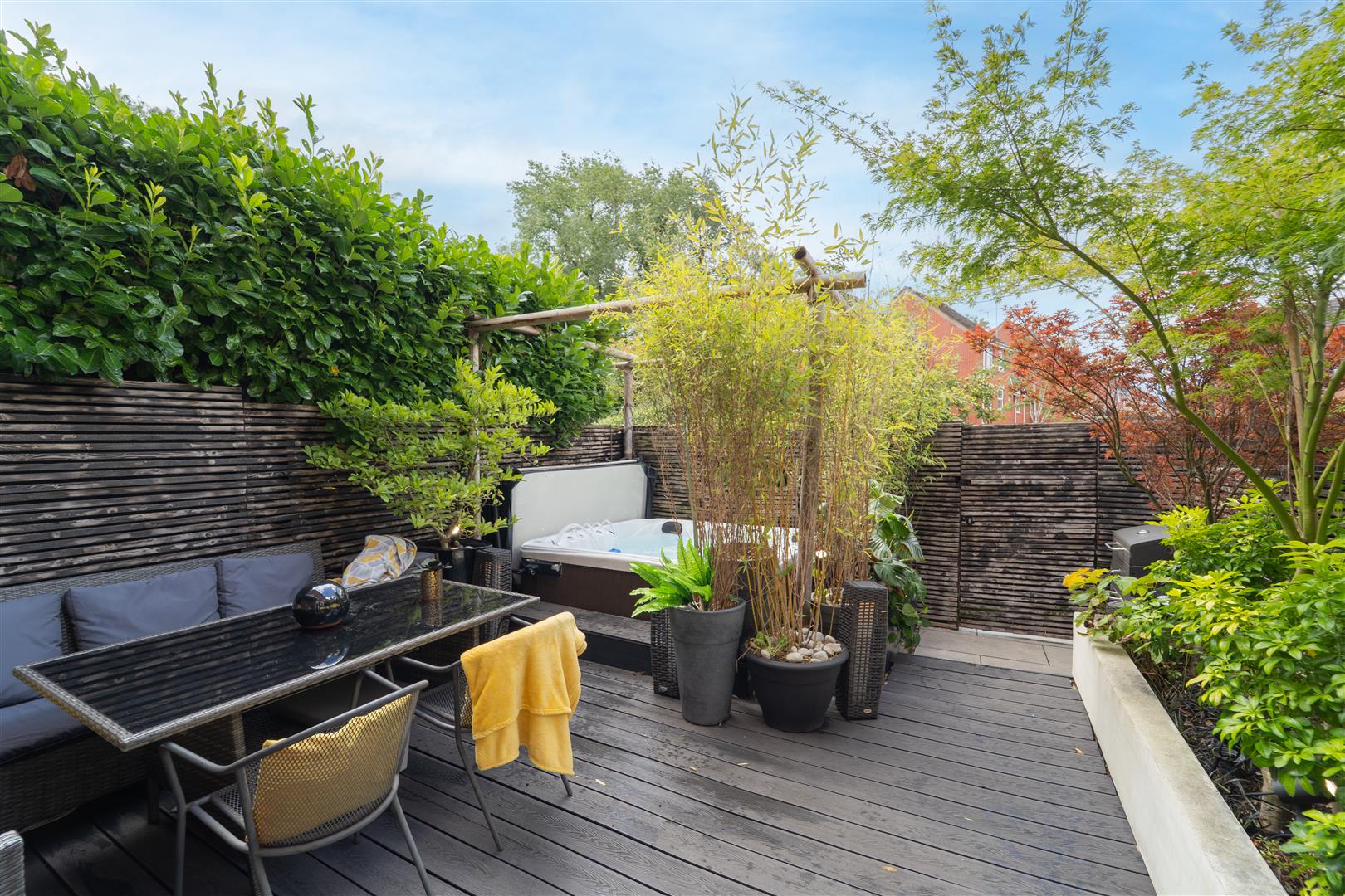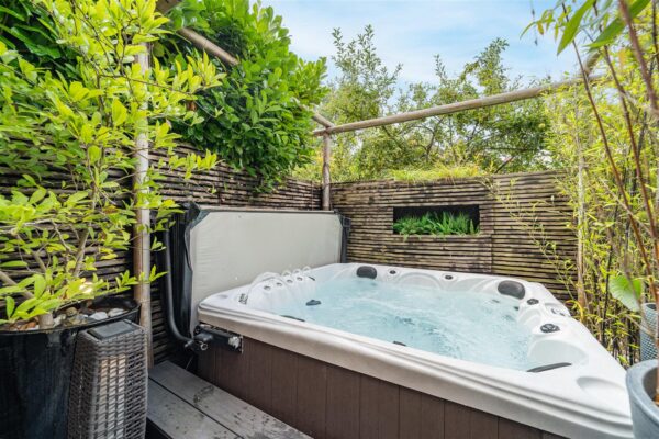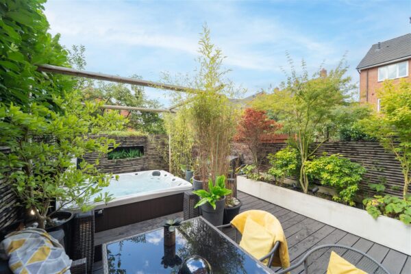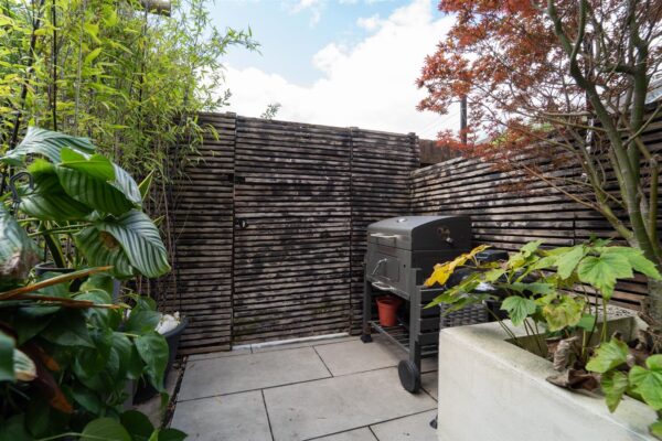 To the front of the property there is a small walled garden with paved steps leading to the front door. To the rear, the garden offers a stylish, low-maintenance space featuring composite grey decking and a large-format tiled BBQ area. A raised white-rendered planter is planted with acers, spring bulbs, grasses, and climbers, creating year-round greenery and privacy. Additional highlights include a bamboo pergola, grey wind-out awning, external socket with trip protection, and striking Shou Sugi Ban fencing with a lockable gate to the car park.