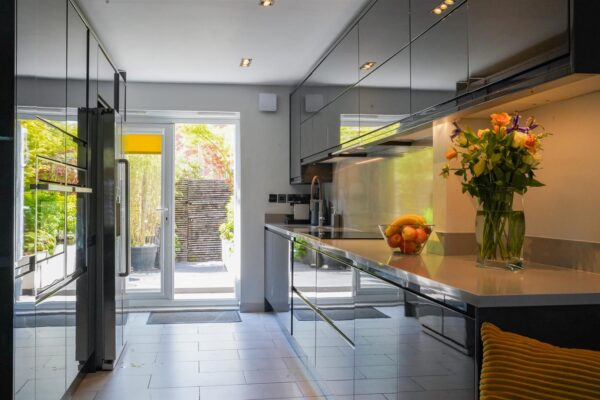 The accommodation briefly comprises a dining room featuring bespoke plantation shutters, which opens into a fully fitted kitchen with high-gloss cabinetry and integrated Neff appliances including a steam over and combination microwave grill, warming draw and flexi-zone induction, the kitchen offers direct access to the south-facing rear garden. A convenient downstairs W.C. completes the ground floor.