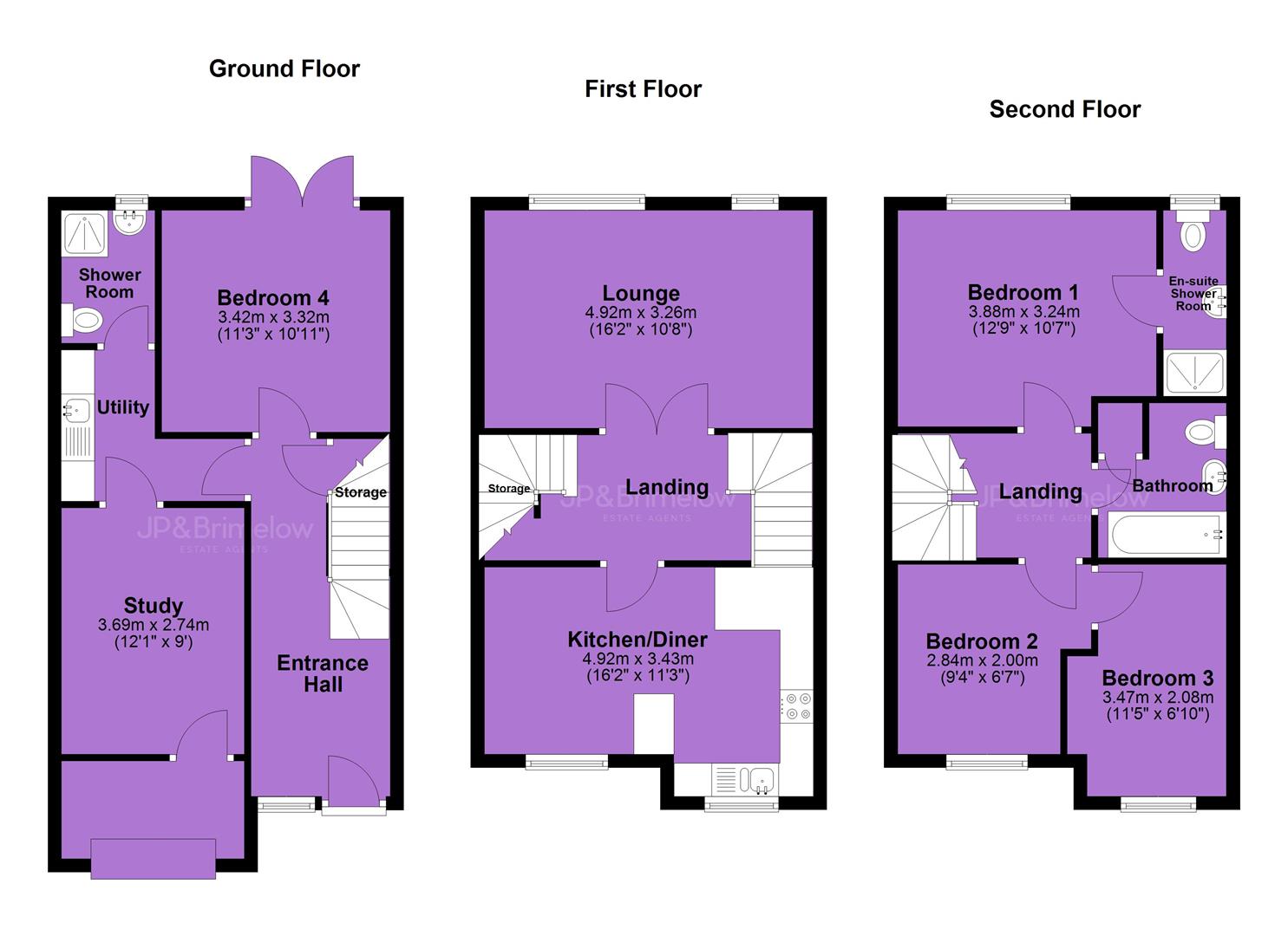 The first floor features a fully fitted kitchen/diner to the front and a spacious lounge to the rear. Stairs rise to the second floor, where the principal bedroom benefits from a modern three-piece en-suite shower room, alongside two further double bedrooms and a three-piece family bathroom.
