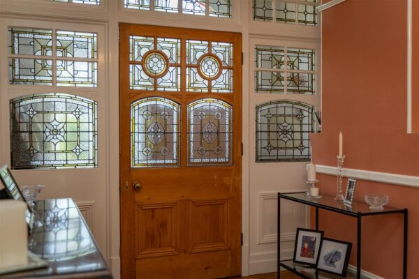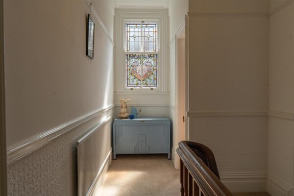 Stairs leading to the first-floor landing that provides an open gallery area with an original wood balustrade and natural light beaming through the stained and leaded feature window to the side aspect, four double bedrooms, and a two-piece bathroom room and a separate W.C.