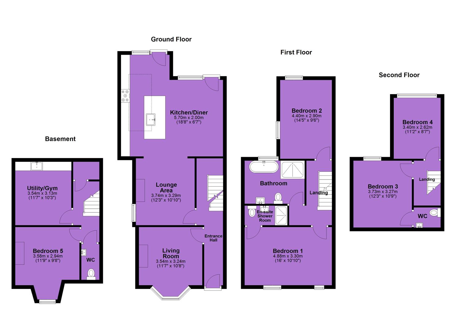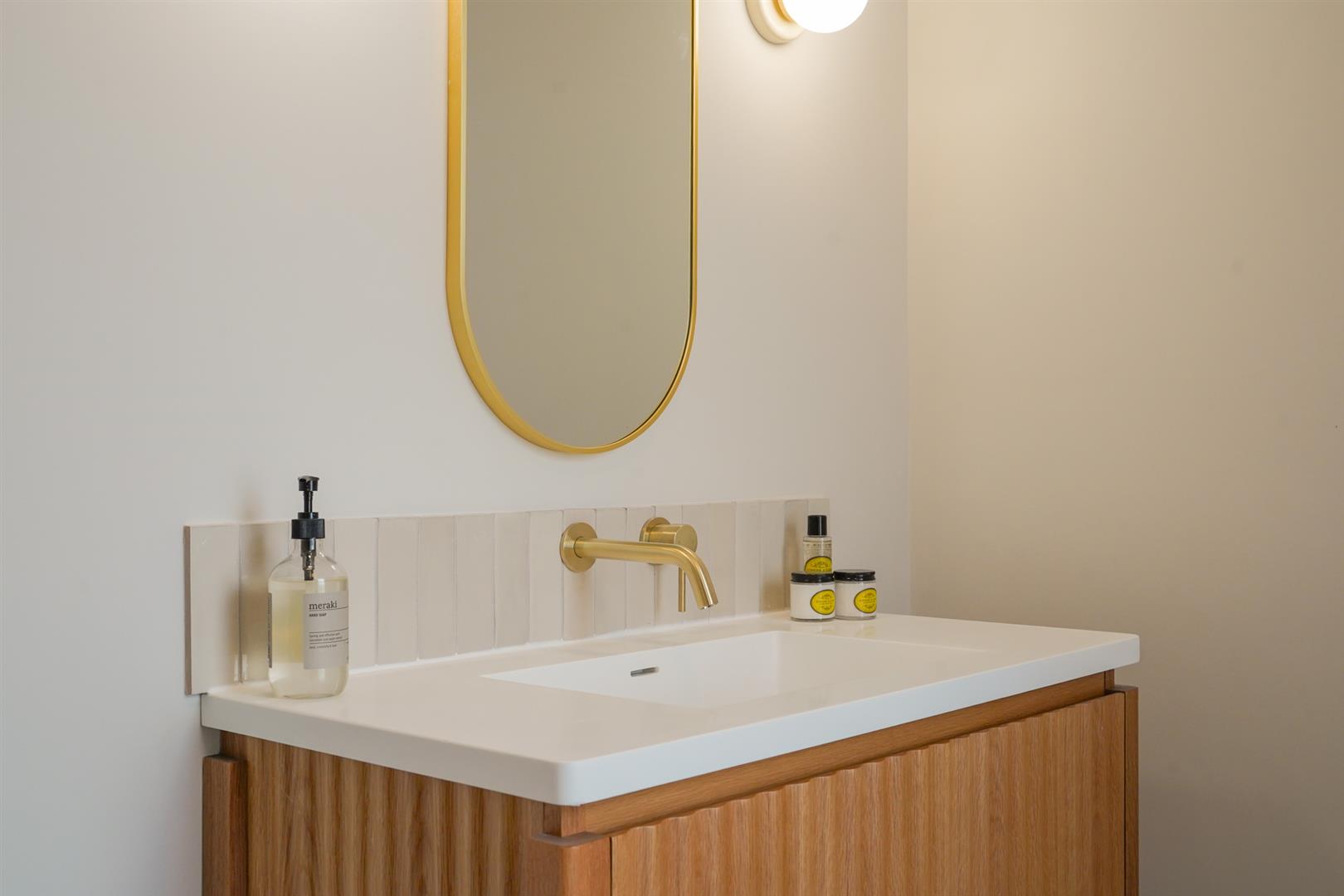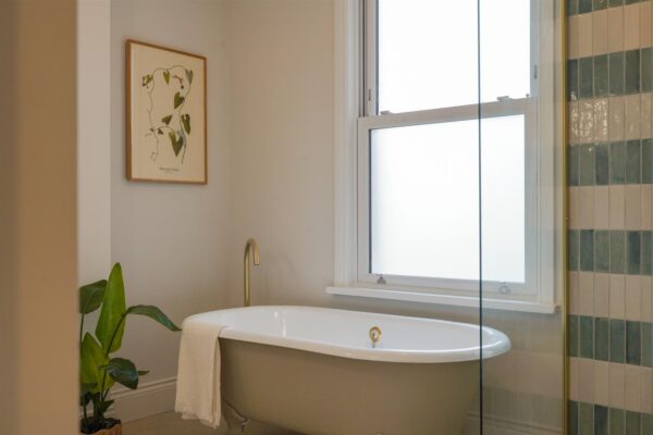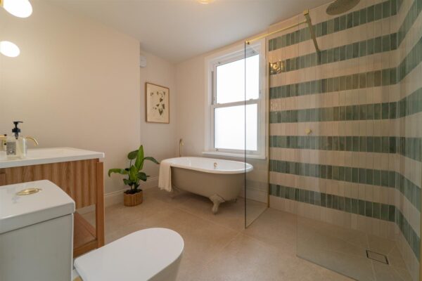 Spread across multiple floors, the property offers a total of five bedrooms. The first-floor hosts two generously sized bedrooms, master ensuite benefits Bert and May pearl alalpardo tiles, ABI concealed and wall mounted brass tapware, large sliding door shower enclosure. The Family bathroom benefits from a walk in shower, Cast Iron Bath, and a Lussostone oak vanity with stone basin.