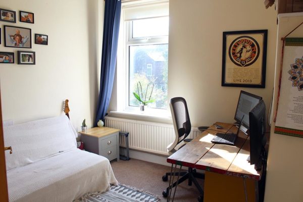 Second double bedroom featuring a rear aspect UPVC double glazed window. Wall mounted radiator and ceiling light point. Exposed wooden flooring.