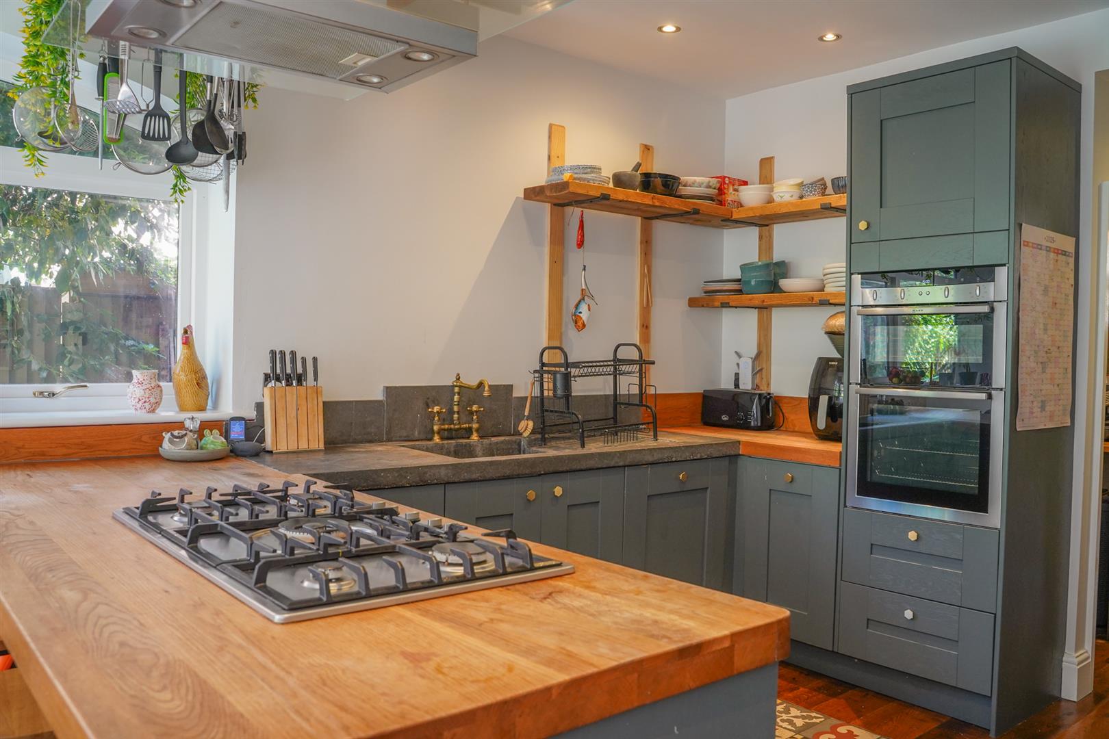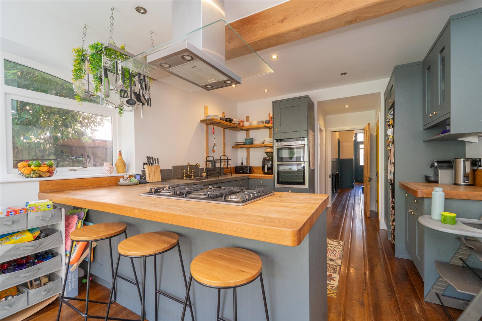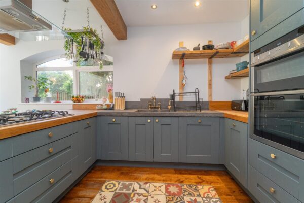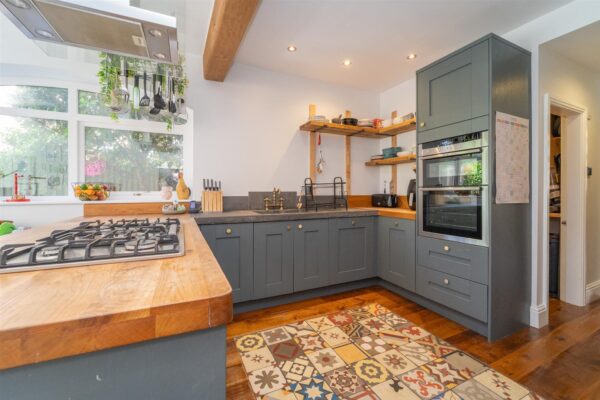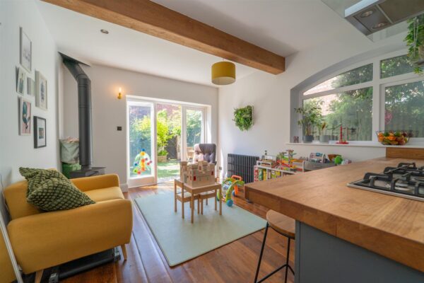 The thoughtfully designed accommodation includes: a vestibule, a welcoming entrance hallway, convenient downstairs W.C., a spacious through lounge and dining room with a bay window to the front, a utility room, and an impressive open-plan fitted kitchen featuring Neff appliances, a breakfast area, and dining space. French doors from the kitchen open out to a west-facing, courtyard-style rear garden.