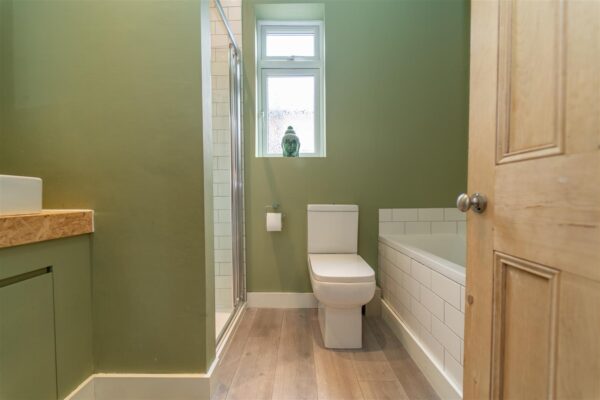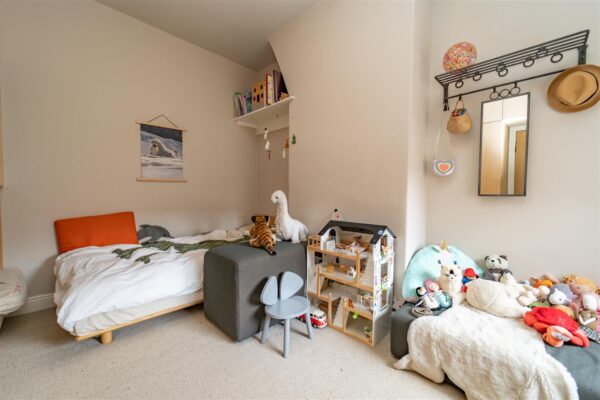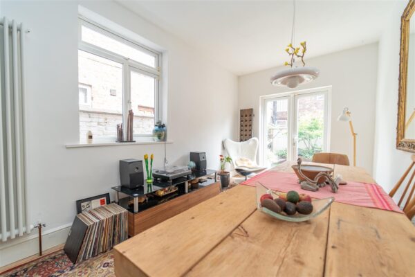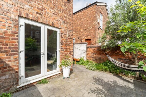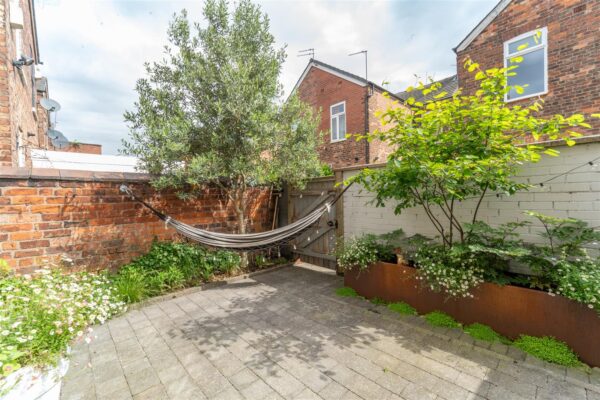 To the front aspect a low level brick wall with a variety of trees and planting around the bay window. The gated entrance leads to a Victorian tiled porch. An East facing rear garden with a paved patio area enclosed by a brick wall. A 2m steel container flower garden, with trees amongst a grass and flower border. A timber gate leads to the service alleyway.