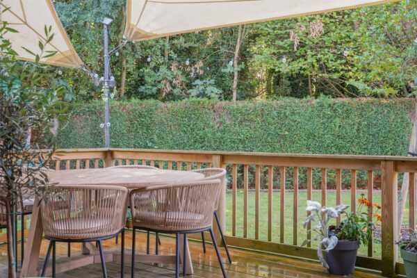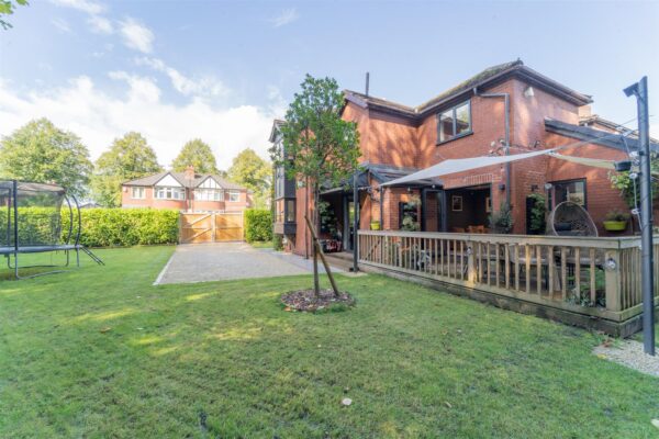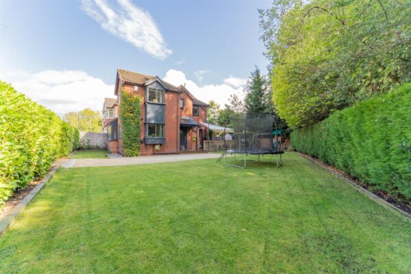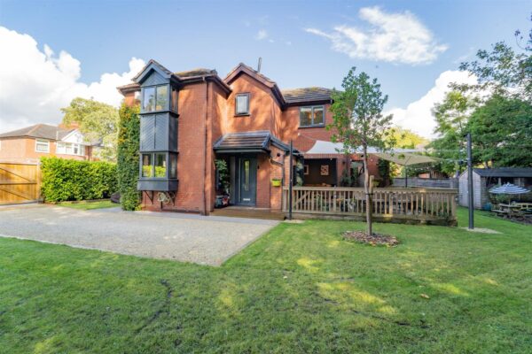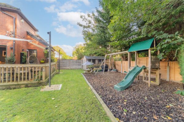 To the front aspect there is timber boundary fencing with mature hedgerow above, creating a sense of privacy, double timber gates open onto a resin driveway providing off road parking for multiple vehicles. There is a generous south facing lawned garden, a raised decked area and a woodchip children’s play area.