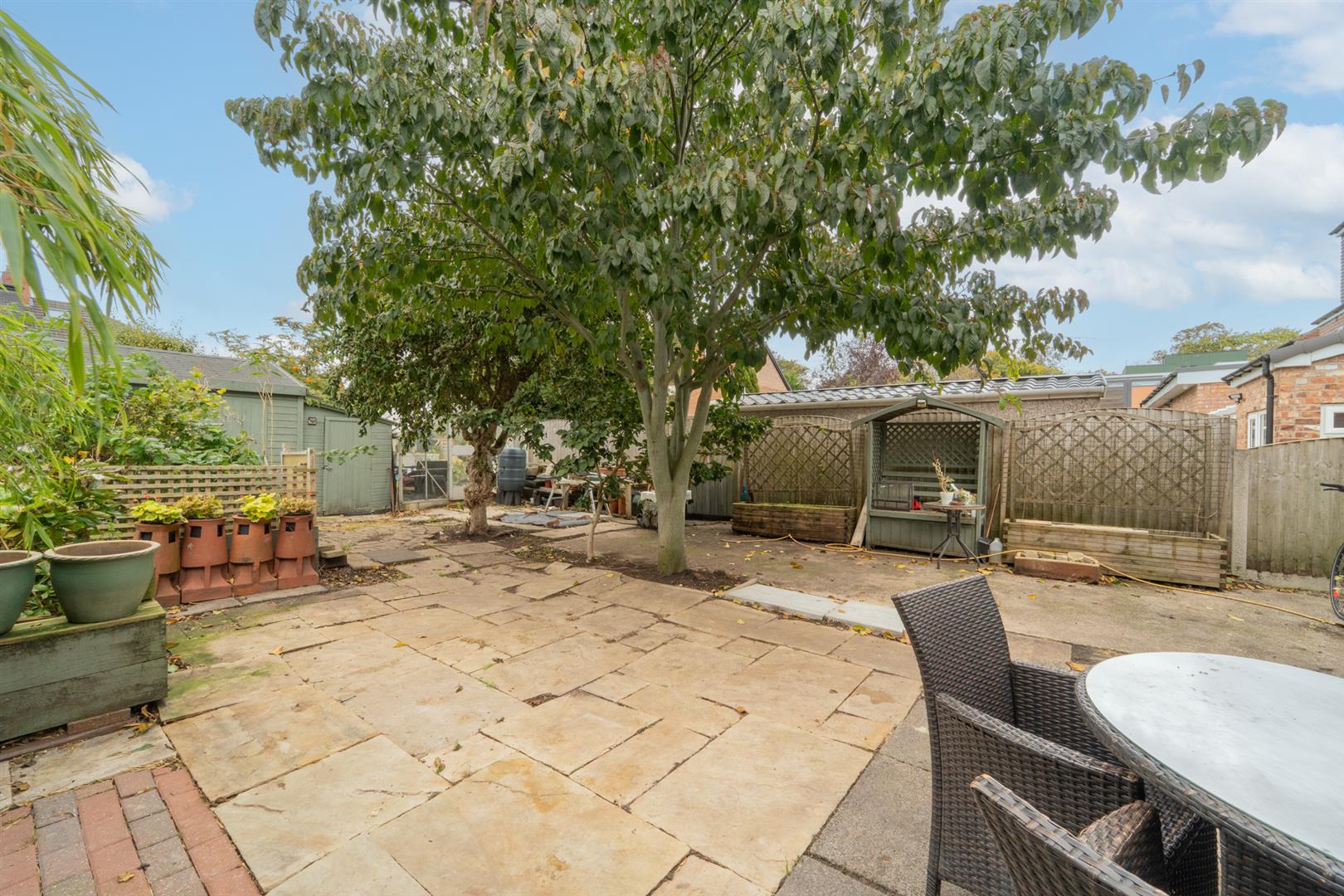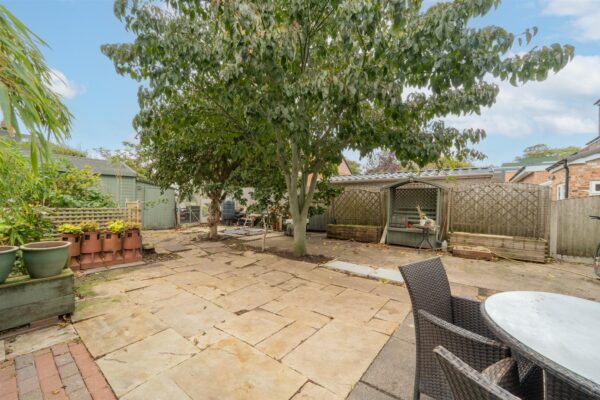 To the front, there is a garden enclosed by a low brick boundary wall, featuring planted flower beds with a variety of shrubs, bushes, and a mature tree. A paved driveway to the side provides off-road parking for up to three vehicles. An iron gate leads to the rear, where there is an enclosed paved garden, ideal for outdoor seating. The space is complemented by a useful wooden workshop filled with plentiful storage and a work bench.
