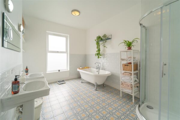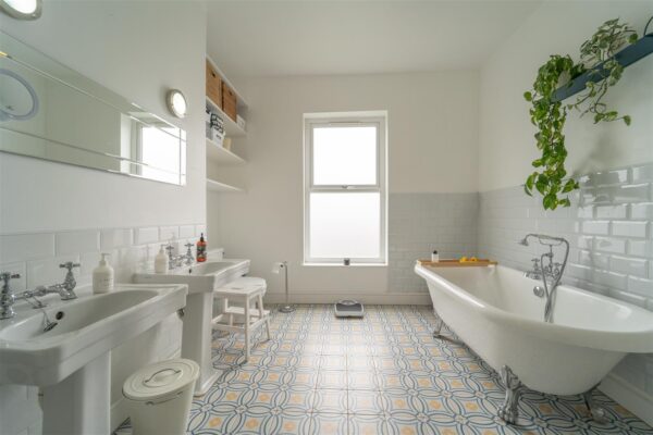 To the first floor there is a landing leading to two double bedrooms and a five-piece white family bathroom with a roll top bath, a shower cubicle and his and her wash basins. There is under floor heating as well.