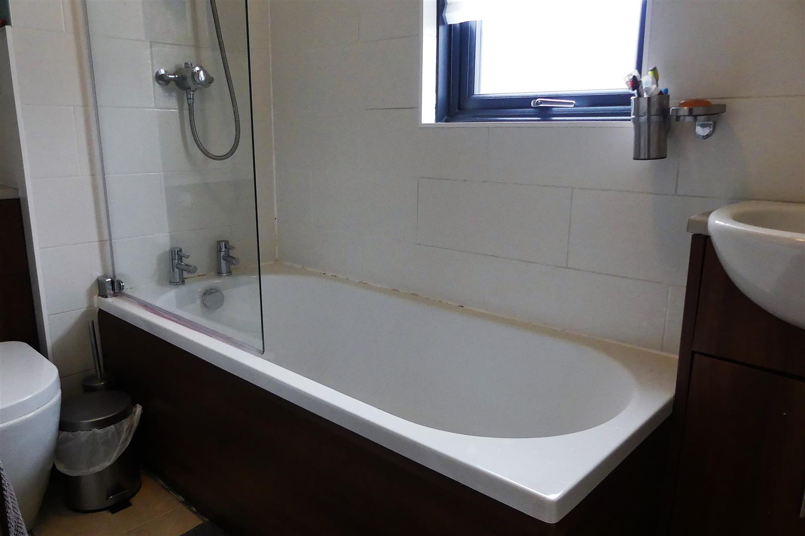 Fitted with a panel bath with shower over. Vanity wash hand basin and low level W.C. Part tiled. Heated towel rail. Ceiling light point and UPVC double glazed window to rear aspect.