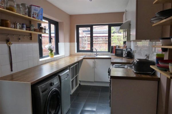 Fitted with a range of base and eye level units. Roll edge work surfaces. Inset stainless steel sink. Tiled splash back. Space and plumbing for washing machine, fridge, freezer, dryer and cooker. Tile effect flooring. Ceiling light point. Two UPVC double glazed windows and door to side aspect leading to rear yard.